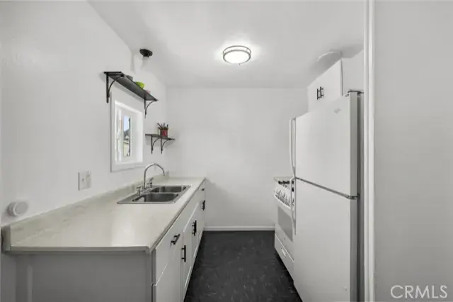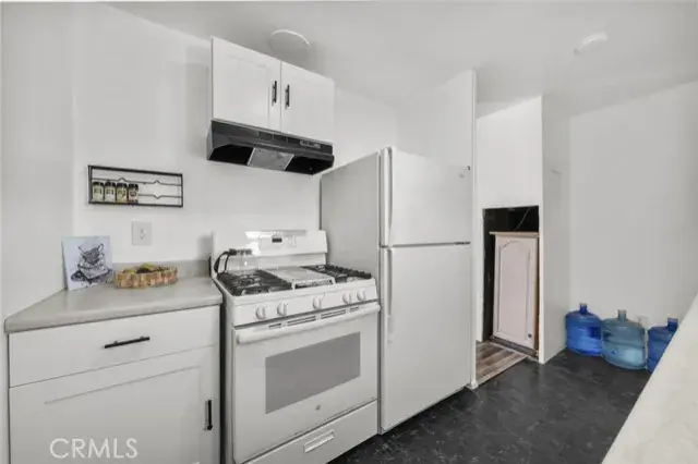 The kitchen comes equipped with warm wood cabinetry, a stove, refrigerator, and a convenient indoor laundry area for added convenience. The primary bedroom is generously sized and includes a walk-in closet, while the secondary bedroom also offers ample space. The full bathroom features tiled flooring, wood cabinets.