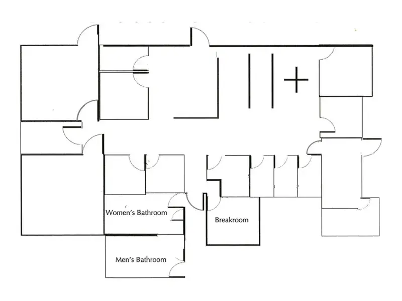 This single level office suite is comprised of nine private offices, two large meeting rooms, open work areas, and a breakroom.