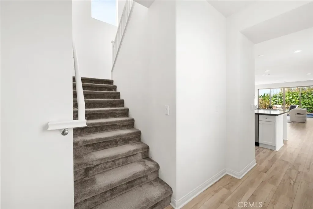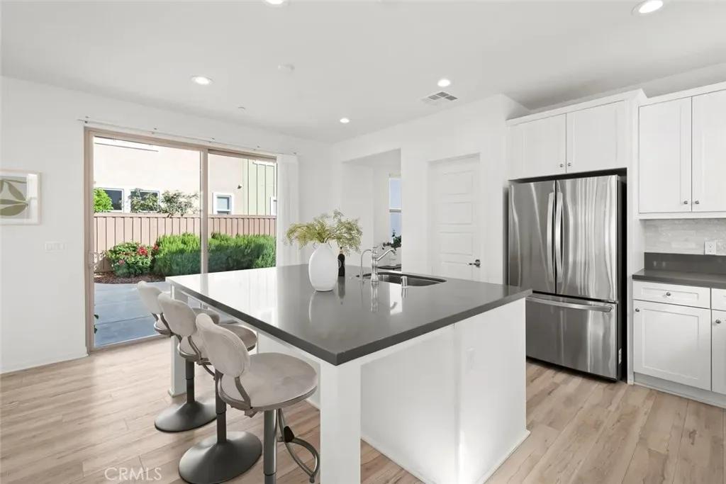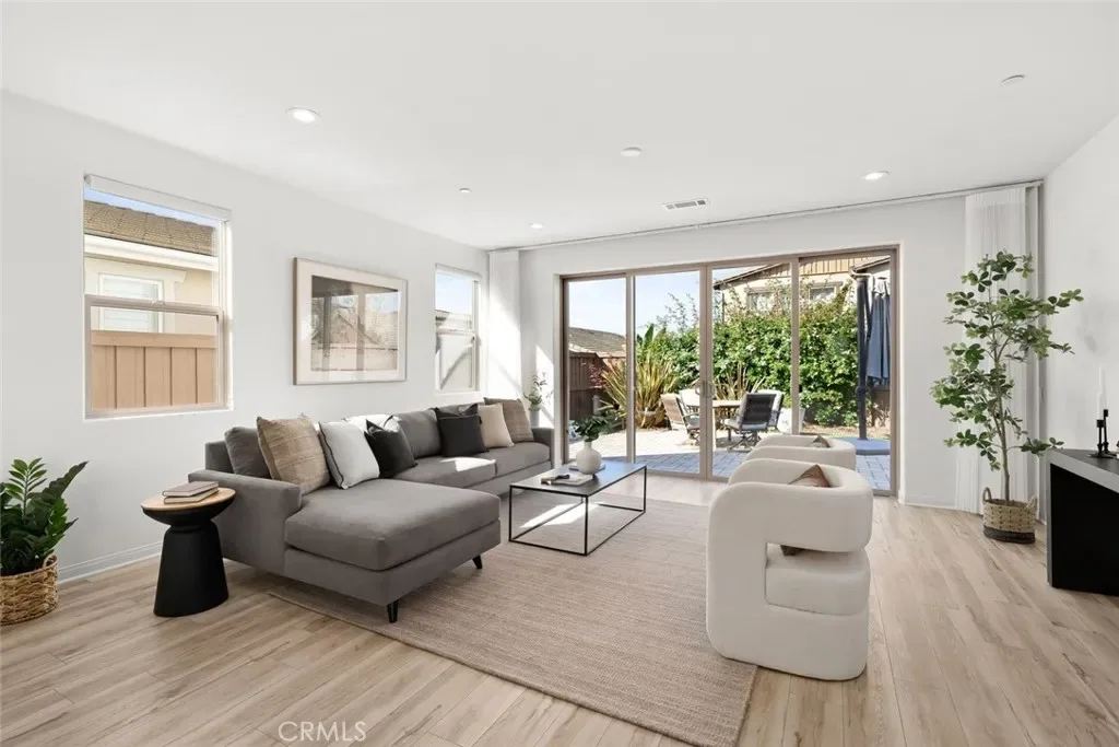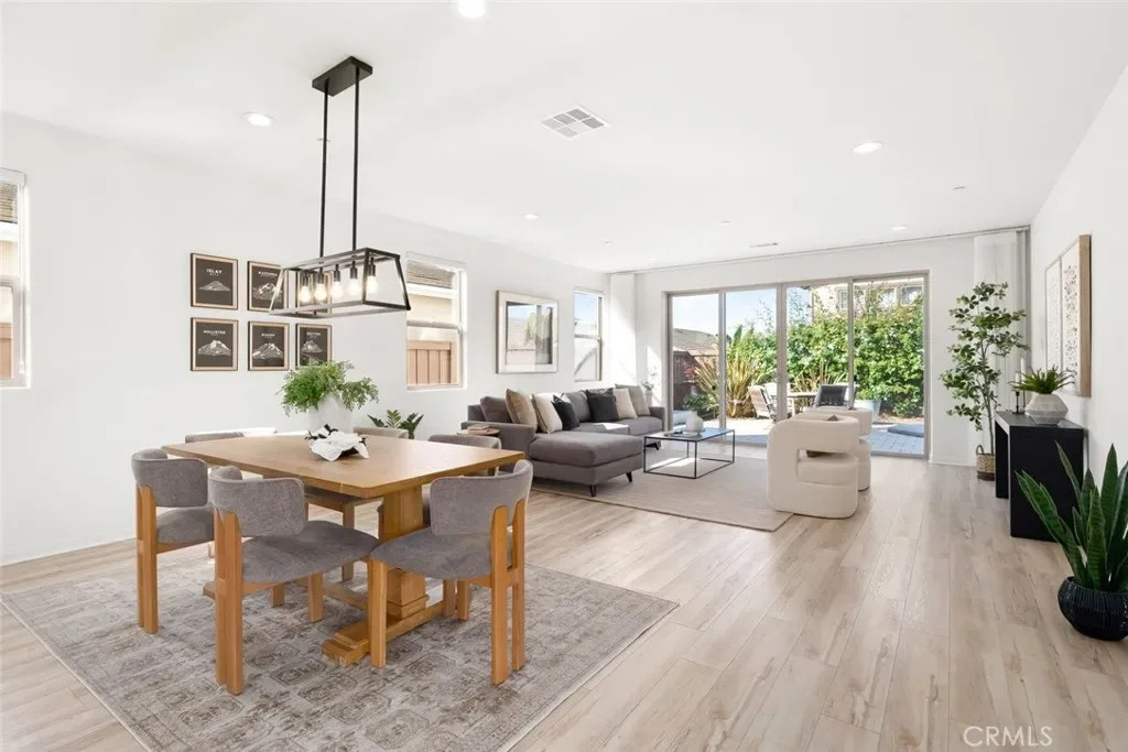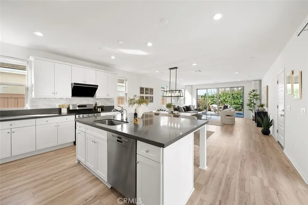 The hallway opens to a bright, open-concept living space anchored by a stunning kitchen with stainless steel appliances, a large center island with bar seating, and a walk-in pantry. Designer-selected lighting above the dining area adds sophistication and mood. The living room is filled with natural light and embraces indoor-outdoor living through glass sliders that open to a serene backyard retreat.