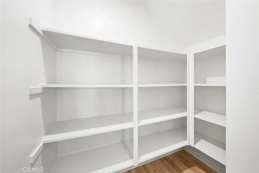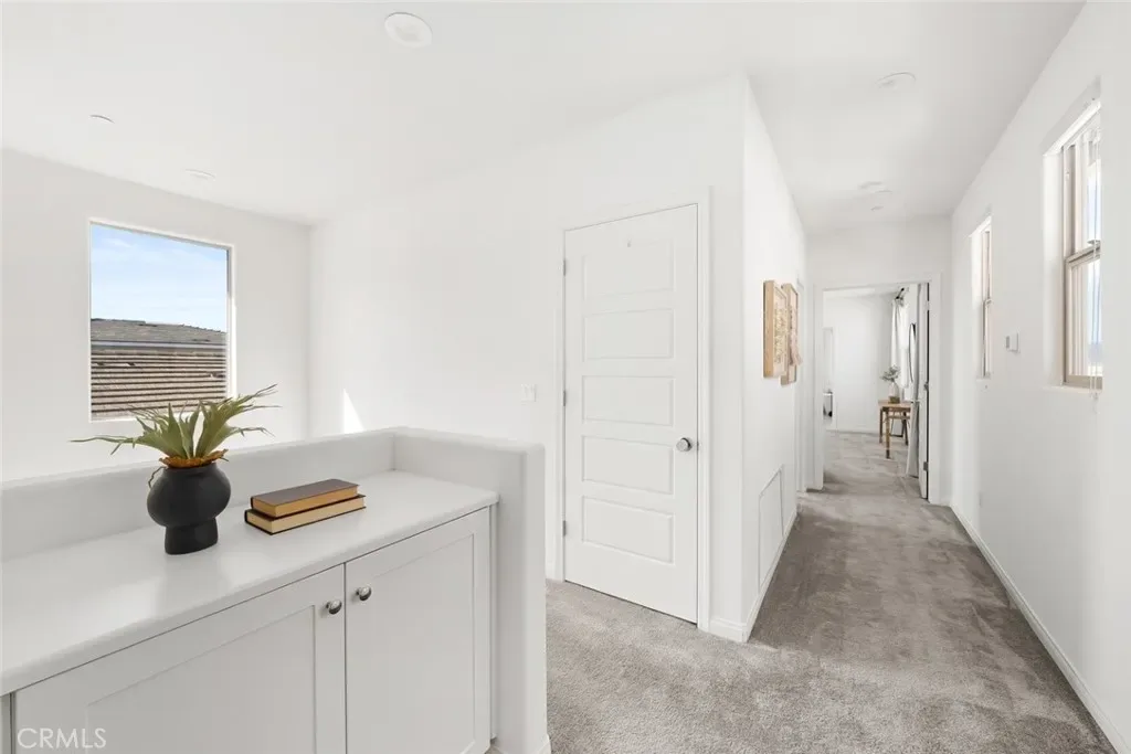 Upstairs, a charming built-in counter with storage offers a functional nook for daily living and organization.
