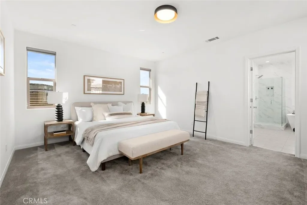 Through the front entrance, you are ushered into a thoughtfully designed floor plan featuring a downstairs bedroom—currently staged as an office—alongside a full bathroom with a walk-in shower and linen storage, ideal for guests or flexible living.