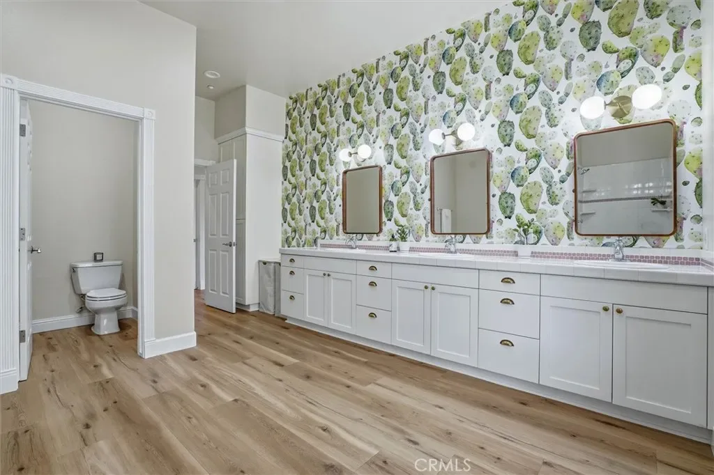 The primary suite is a private sanctuary, complete with its own fireplace, dual walk-in closets, and a spa-inspired bath with soaking tub and dual-head shower. Additional bedrooms are generously sized, including one with an en suite bath, while a secondary bathroom offers a large three-sink vanity, soaking tub, and walk-in shower. A hallway storage room and a spacious bonus room above the three car garage add even more flexibility. The home also includes dual zone heating, roof mounted solar, and an EV charger in the garage. The detached guest suite features a kitchenette, bath and laundry, making it perfect for out of town guests.