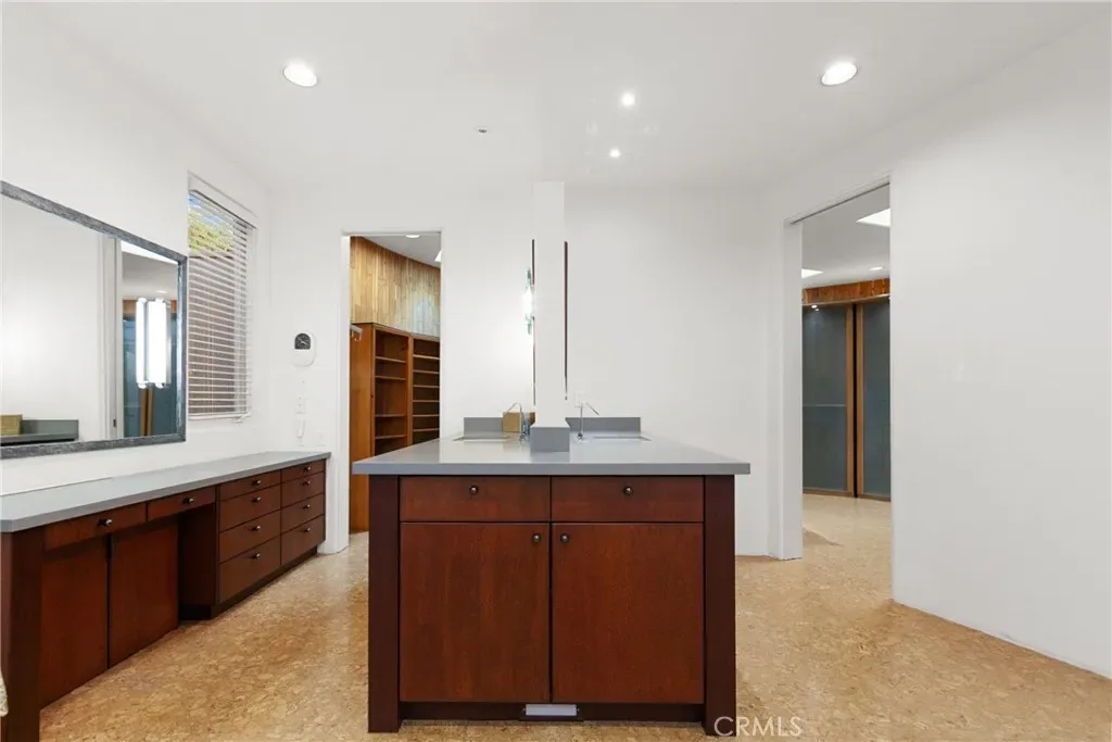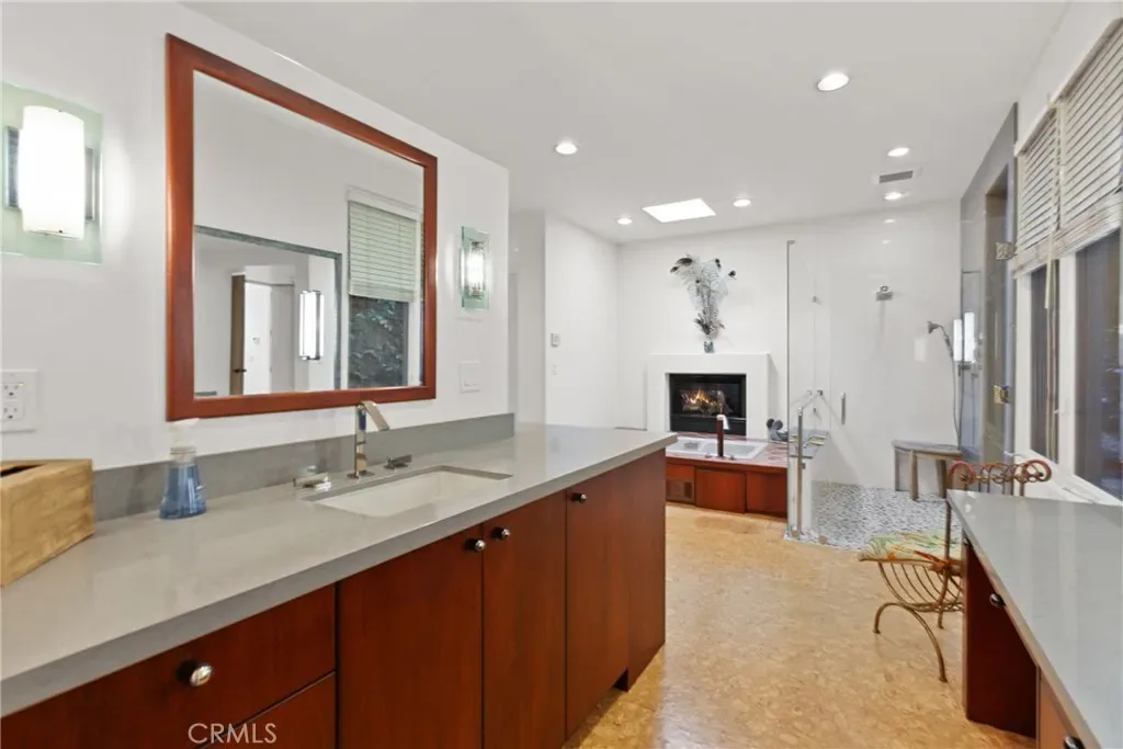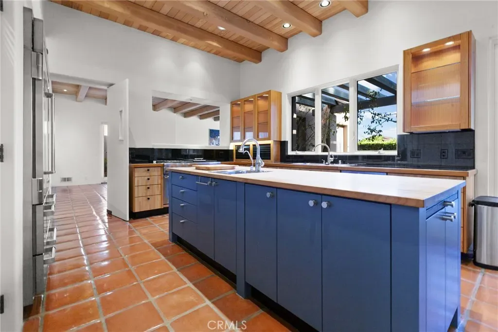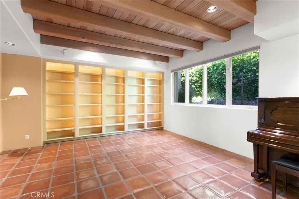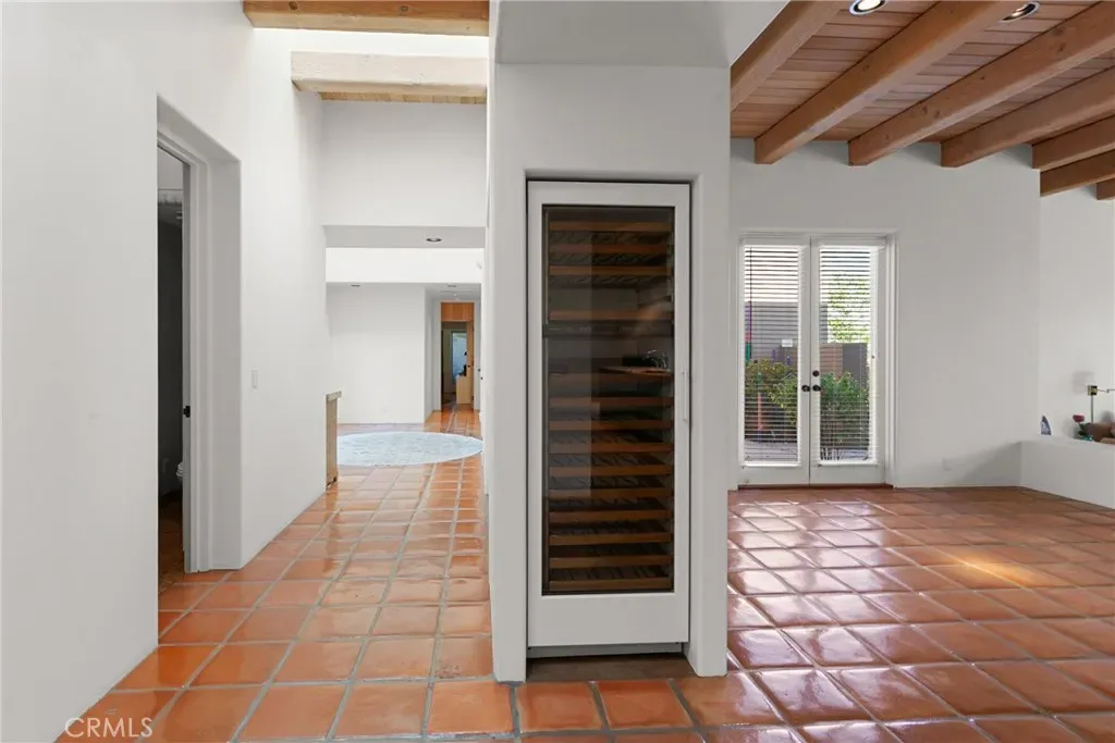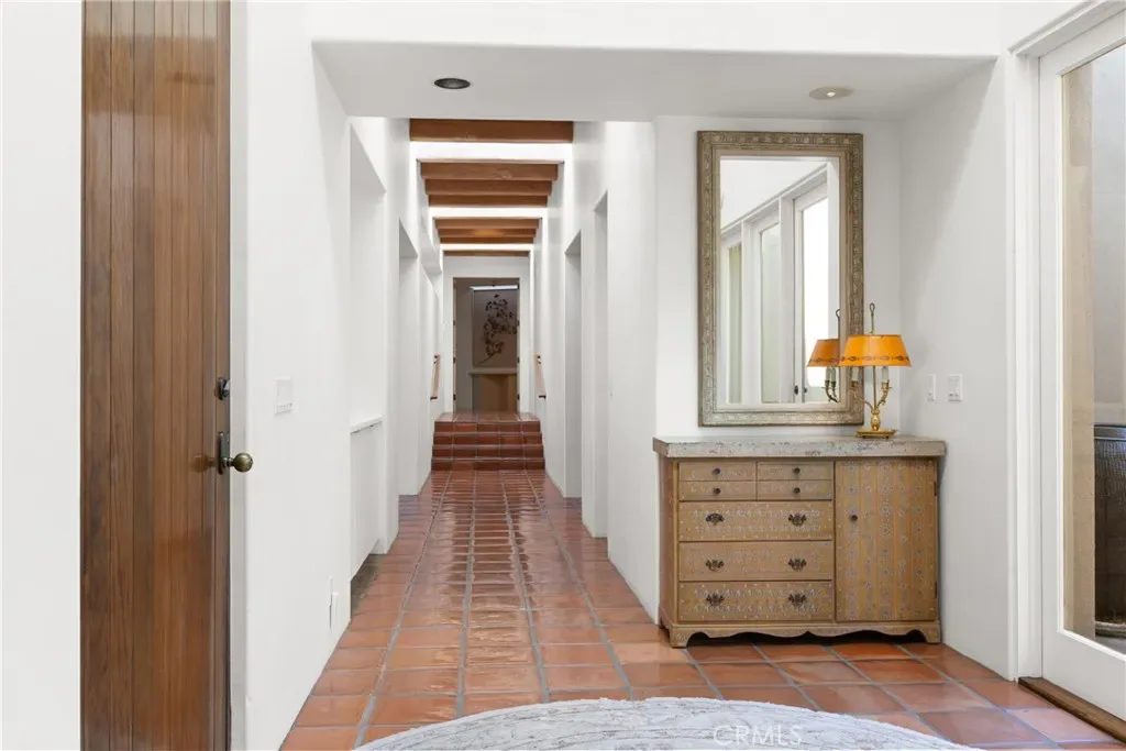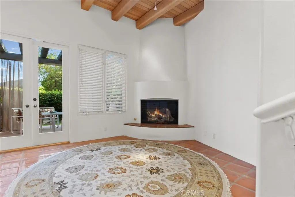 Throughout the home, high ceilings with exposed wood beams, smooth stucco walls, and polished Saltillo tile floors enhance the warm, authentic style. The luxurious primary wing offers exceptional privacy and features a wall of custom built shelving and abundant storage, along with a striking two-sided fireplace that adds warmth and ambiance. The expansive primary suite includes a serene sitting area and spa-inspired full bath with two separate vanity areas.