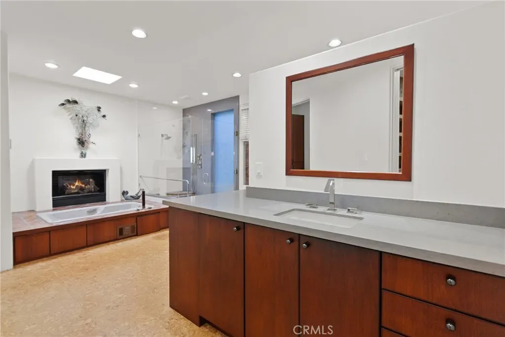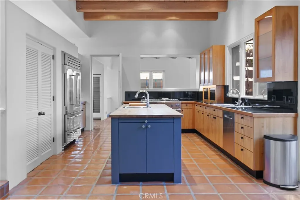 The sun-filled kitchen is both stylish and functional, offering a large center island, Sub-Zero refrigerator, and 6-burner Thermador range. The adjoining breakfast area, complete with its own fireplace and French doors, opens to a lovely patio—perfect for morning coffee or relaxed al fresco dining.