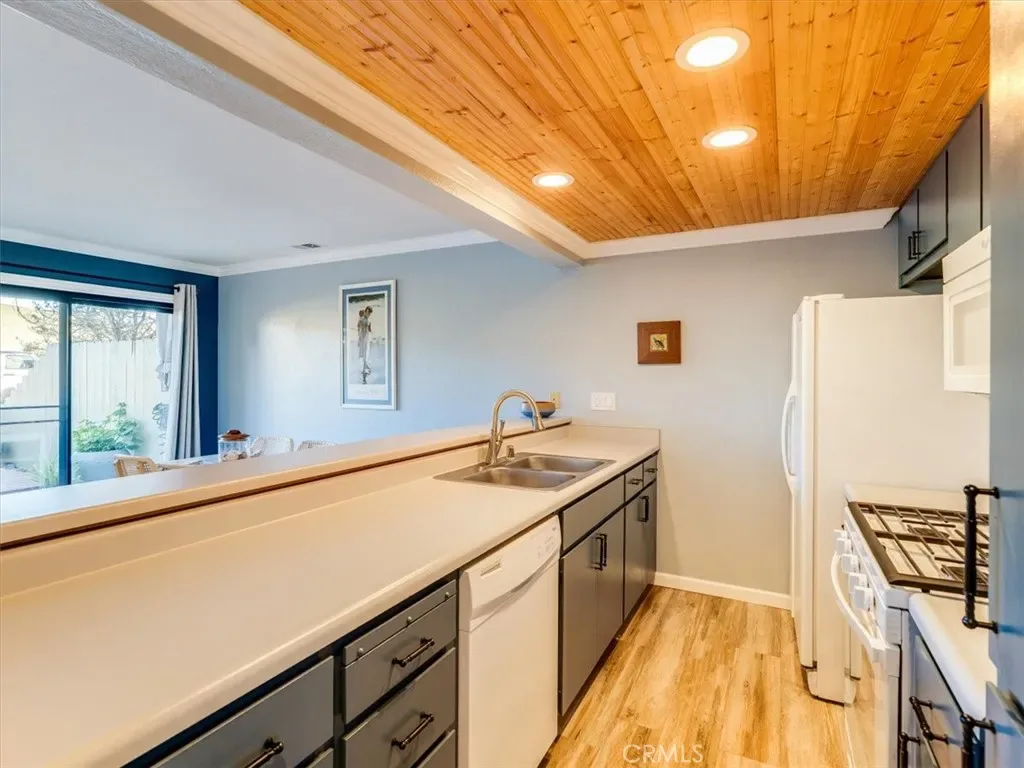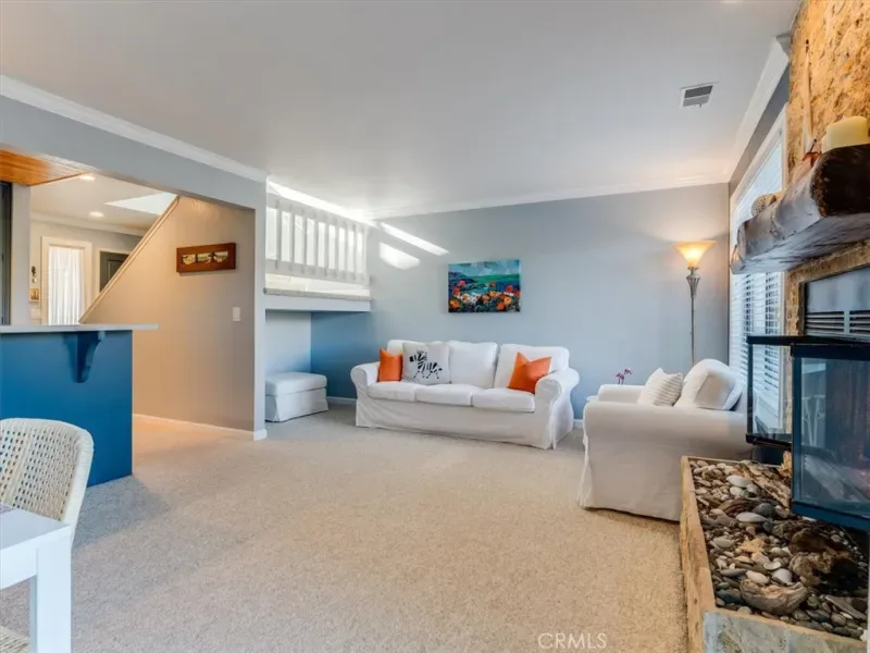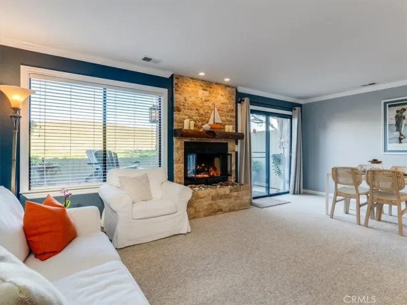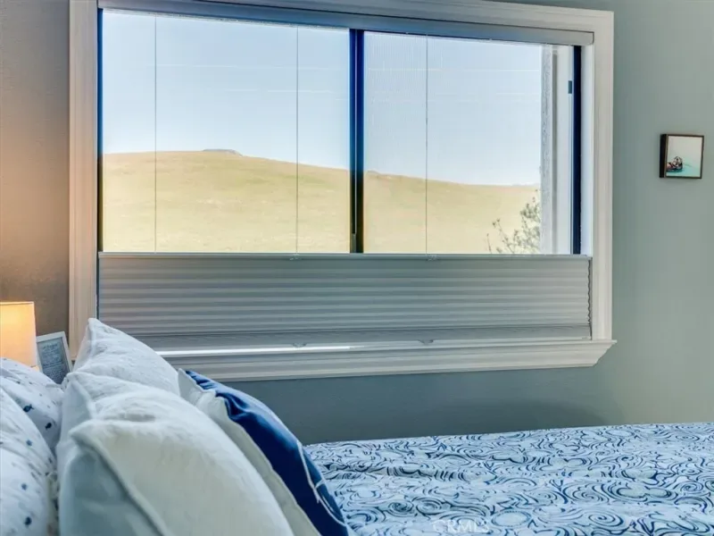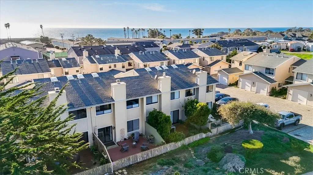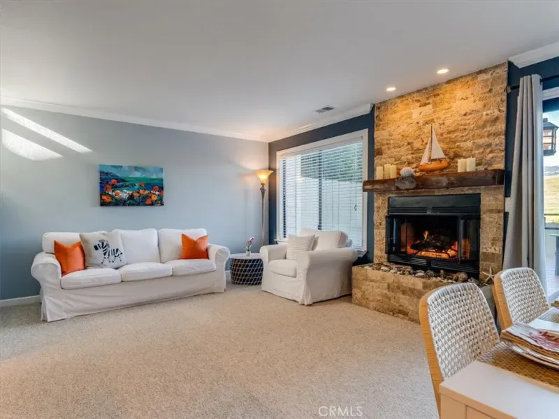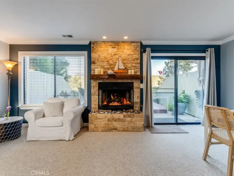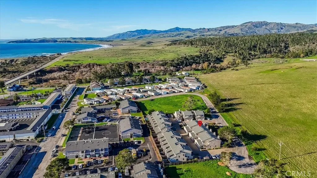 This peaceful coastal retreat offers the lifestyle you’ve been waiting for, where mornings begin with sunrises over rolling hills from your private back deck and evenings end with glowing ocean sunsets viewed from the spacious primary bedroom suite. Located just a short walk from the beach, the home enjoys a rare natural setting, with the Hearst Ranch—protected by a permanent conservation easement—as its eastern neighbor and the occasional zebra wandering by. The three-bedroom home features a generous primary suite with high ceilings, while the living and dining rooms are anchored by a beautiful stone fireplace with a natural wood mantel, creating a warm and inviting space for reading, relaxing, or entertaining, all enhanced by soaring ceilings. Move-in ready and meticulously maintained, the home is sparkling clean and finished in a soothing coastal color palette throughout, with crown molding, Berber carpet, an updated kitchen, dual-pane windows, and a new furnace. Recent upgrades include new up-down shades in the primary suite, new blackout up-down shades in the eastern bedrooms, a new Speed Queen washer and gas dryer, and a garage with newly built shelving. Blooming roses grace both the front and back gardens, complemented by drip irrigation in the front garden. The entire complex has been freshly painted and features attractive pavers, upgraded garage lighting, and well-maintained landscaping, all supported by low HOA fees and a well-functioning association. Whether as a holiday getaway, family home, or retirement retreat, this property offers a truly desirable location and an exceptional coastal living experience.