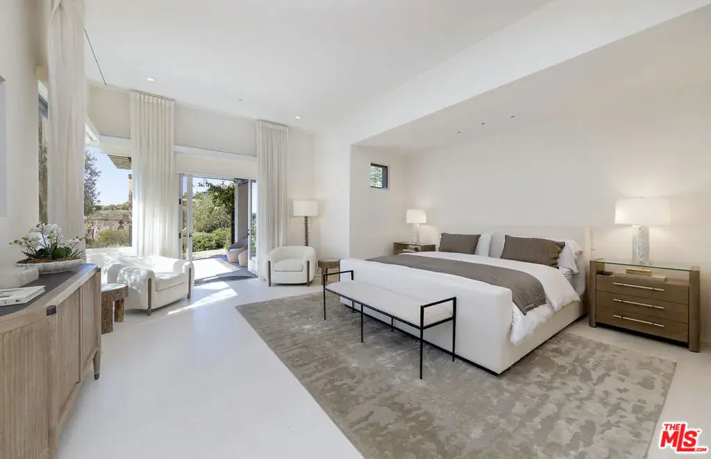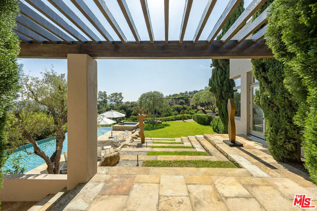 A sophisticated retreat in the hills of Montecito, this architectural gemdesigned by internationally renowned Barry Berkusboasts incomparable views of the harbor, Pacific Ocean, Channel Islands, and beyond. The 4-bedroom, 4-bath residence is a masterful expression of bold lines, soaring ceilings, and light-filled interiors. Champagne limestone floors flow continuously throughout the home. The landscaping, curated by acclaimed designer Mark Rios, elevates the outdoor experience with serene gardens featuring a koi pond, lavender beds, an infinity-edge pool with spa, towering cypress trees, climbing bougainvillea, and a charming alfresco dining area shaded by century-old olive trees. This is a Mediterranean daydream-just ten minutes from Coast Village Road and Butterfly Beach.A beautifully carved door marks the entry, revealing an alle of cypress trees that sets the tone for the tranquil elegance within. The open-plan living and den areas feature 15-foot ceilings, exposed wood beams, a skylight, and clerestory windows that bathe the space in natural light. Defined without walls, the layout flows effortlessly. Just off the main living area, a spacious private study-or optional fourth bedroom-offers flexibility and privacy. The kitchen and dining areas, accessed through another set of French doors, are designed for both function and beauty. Oversized windows frame panoramic views, while a central Caesarstone island anchors the space. Top-of-the-line appliances include a Viking cooktop and ovens, Sub-Zero refrigeration, and Miele appliances. A few steps above the main level, the bedroom wing includes two en-suite guest rooms and a beautifully reimagined primary suite. The primary suite enjoys its own private patio with ocean views, a luxurious dressing area with custom European-style closets, and a serene spa-like bath. Picture windows frame Japanese maples, while a soaking tub, seashell limestone counters, and bespoke cabinetry complete the sanctuary. Additional amenities include a Sonos sound system throughout the interior and exterior, newly installed solar panels with backup battery, and access to a shared private well with two neighboring residences. Located on a quiet private lane, this exceptional home offers the perfect balance of refined design and peaceful seclusion.