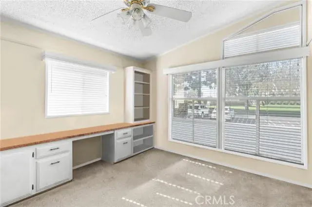 The primary bedroom includes an en-suite bathroom with a shower/tub combo, an oversized single vanity with storage, a ceiling fan, a walk-in closet, and private sliding door access to the backyard. Two additional bedrooms provide flexibility—one with oversized windows and a ceiling fan, and the other ideal as an office with built-in storage and a desk. A second full bathroom includes a shower/tub and single vanity.