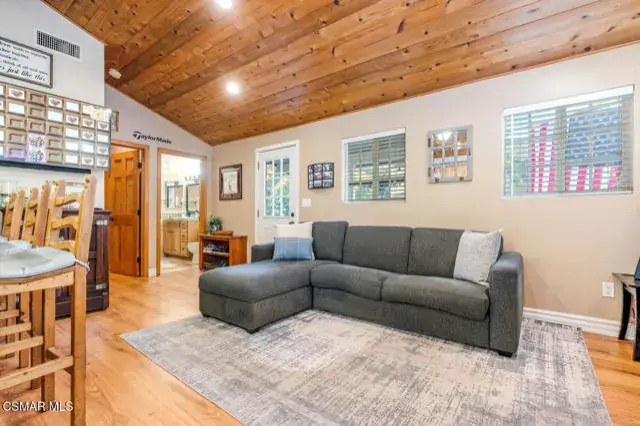 Be a part of the Santa Susana Knolls’ history. Studio filming, Corriganville, Tarzan, Cowboys, Jurassic Park. nearby Corriganville has it for your hiking and touring pleasure as this home is just a couple minutes away.This 1928 absolutely charming cabin home is one of the original homes built in ”The Knolls,” an ecelctic communty within the borders of East Simi Valley and the San Fernando Valley. You’ll recognize the home by the mulberry tree in the front yard, artificial grass and the pretty red painted front door and where, in the Great Room, you’ll find proudly displayed photos of the old Alta Vista Road, the old Railroad Station and The Santa Susana Pass Road. The original Knolls brochure of cabin sites being sold is in the home to be viewed..1088 Alta Vista has been completely remodeled with pine vaulted ceilings, kitchen with hickory cabinets, some pull-outs, bar stools included, double sink, gas cooktop, disposal, dishwasher and refrigerator included, finished with warmth that lends itself to entertaining friends and family.The Great Room concept provides lots of natural light, and gives you a setting of modern living or from the days of a weekend retreat set among oak trees, gorgeous peacocks that roam the streets and rooftops (check out the feathers in the Great Room).The spacious bedroom, with french doors to a private rear deck, has two double wardrobe closets with partial built-in cabinetry and views of the mountains that sooth the soul when enjoying the atmosphere of The Knolls and while you sip your coffee in the morning or wine in the evening.The bath also has been remodeled with Travertine flooring, stone counter and shower, floor to ceiling.Laminate flooring, vinyl blinds, utility room inside with washer/dryer hookups, ceiling fans and the mounted TV is included. Surround sound is a cleverly designed hidden floor compartment with integrated electrical outlets provide convenient power access while keeping cords and devices neatly out of sightThe side yard has been extended to accommodiate a trailer or other vehicle and room for other toys, behind gates for privacy. Easy care of the exterior with ”hardy” siding.Below and underneath the main house is an anteroom, workshop or as is called ”The Den”.with electrical wiring and systems including surround sound wiring, workshop, storage and newer AC, ductwork and tankless water heater.Close to Corriganville, a public park, Santa Susana Railroad Depot and Museum, Old Santa Susana Cafe, delicous food and ambiance and other facilities to serve you.If you’re seeking quiet, serenity, a place to create your works, The Knolls and this home is for you.