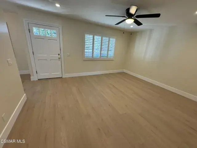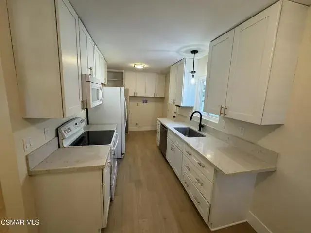 Welcome to this updated, single story home in the desirable Rancho Sequoia neighborhood. Freshly painted throughout with smooth ceilings, updated dual pane windows, and gleaming wood laminate floors, this home offers comfort and style. The inviting living room flows seamlessly into the cook’s kitchen featuring quartz countertops, updated cabinetry, a large stainless steel sink, and attractive tile flooring–perfect for everyday living. Both bedrooms are ample sized, with one offering direct access to the backyard through a sliding glass door. Additional highlights include central air and heat, an indoor laundry area, and a convenient direct access garage. Tucked away on a quiet interior lane just off the main street, this home offers easy access and ample parking. Located just minutes from local parks, shopping, and schools, it’s the perfect blend of privacy and convenience.