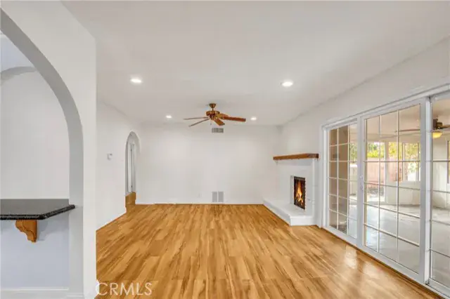 Step inside to discover a bright and airy open floor plan adorned with arched doorways, smooth ceilings, recessed lighting, and elegant crown molding. The living room exudes warmth and charm with its classic brick fireplace, ideal for cozy evenings. Dual-pane windows invite abundant natural light, while the **fully owned solar panels** promise energy efficiency and low utility costs. The kitchen is designed for everyday enjoyment and entertainment, featuring granite countertops, a stainless-steel sink, and ample cabinetry and countertops.