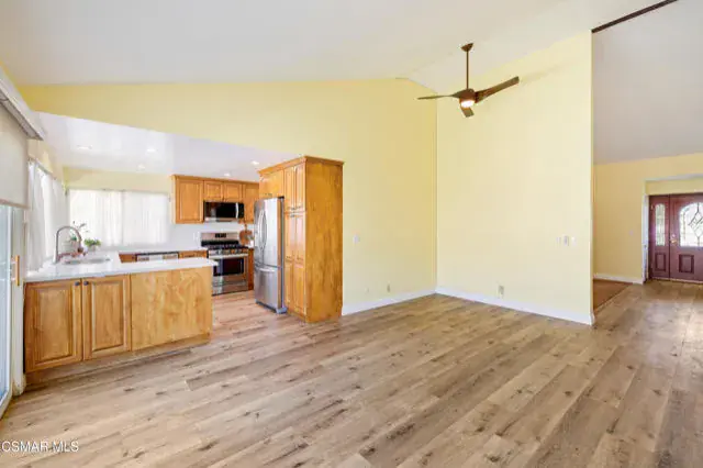 This beautifully updated single-story home offers a seamless blend of comfort and modern upgrades. Featuring 4 bedrooms, 2 bathrooms, and a 3-car garage, the residence has been thoughtfully enhanced throughout.The bright, sun-filled kitchen overlooks the backyard and has been recently remodeled with quartz countertops, hardwood maple cabinetry with pull-out shelves, and stainless steel appliances. The home provides two distinct living areas with premium vinyl wood flooring throughout including a welcoming family room adjacent to the kitchen and a formal living and dining area featuring soaring vaulted ceilings and a cozy fireplace.Both bathrooms have been stylishly remodeled, and ample storage is available with extra hallway closets and built-in linen cabinetry. Energy efficiency is a standout feature, with dual-paned windows, recessed lighting, insulated exterior walls, and a new HVAC system with updated ducting installed in 2025.The spacious backyard is ideal for outdoor living, offering a concrete patio, lush grassy area, and flagstone side yards perfect for entertaining or relaxing. Centrally located near top-rated schools, shopping, dining, parks, and hiking trails, this home combines modern amenities with an ideal location.