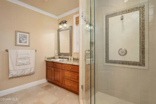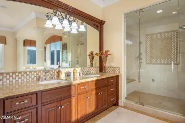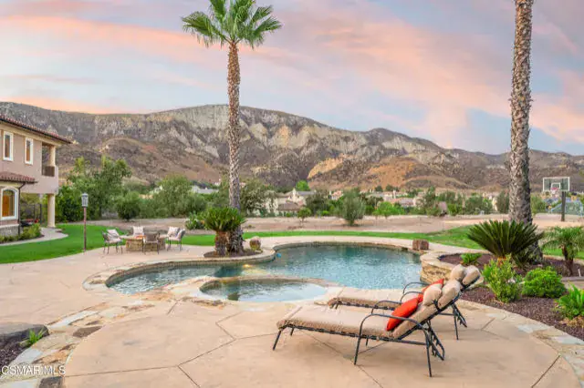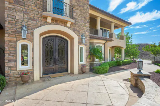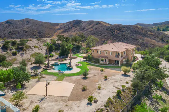 A PRIVATE HILLTOP MEDITERRANEAN / TUSCAN-STYLE LUXURY ESTATE.Perched atop a secluded hill with sweeping mountain views, including the iconic Whiteface Mountain Ridge. This Tuscan-inspired estate blends timeless design, fine craftsmanship, and modern comfort for an exceptional indoor-outdoor lifestyle. Built in 2009, the residence offers 5,380 sq. ft. of refined living space on 2.73 private, gated acres. Designed for both elegance and function, the home features six rooms: four spacious ensuite bedrooms, each designed to provide comfort and privacy for family or guests, a serene reading room, and a large home office.Enter through a striking handcrafted wrought-iron doors with detailed scrollwork into a grand foyer with soaring 25-foot ceilings, a dramatic chandelier, arched columns, and elegant travertine flooring. A sweeping curved staircase with decorative wrought-iron railing sets the tone for the refined interiors. Oversized windows and doors flood the home with natural light, enhancing its warm, open ambiance.The chef’s kitchen is equipped with top-of-the-line Viking appliances, Sub-Zero refrigeration, custom kitchen cabinets with an oversized island ideal for entertaining along with prep kitchen with warming drawer and butlers pantry. A custom, temperature-controlled walk-in wine cellar adds a luxurious touch for connoisseurs. Throughout the home, high-end finishes–such as hand-distressed solid American hardwood floors, granite, marble, and travertine–elevate the design. The formal dining and living rooms are enhanced with custom copper-toned paint, while the great room anchors the home with a fully integrated surround sound entertainment system. The ground-level guest suite provides lovely comfortable accommodations for in-laws and visitors.The upper East wing of he residents offers two bedrooms and a spacious home office, each with breath taking views of the surrounding hills. The West wing is dedicated to the luxurious primary suite, accessed through double doors and a grand hallway with 2 walk in closets. This private retreat features a separate reading room with a dual-sided fireplace and a private balcony overlooking the majestic Whiteface Mountain Ridge–perfect for morning coffee with a view.The spa-like primary bath is inspired by ancient Roman baths, showcasing detailed stonework, an oversized drop-in Jacuzzi tub, and a steam shower to help you unwind in complete luxury.Step outside and enjoy resort-style amenities including a custom pool and spa, an outdoor kitchen with professional-grade appliances, a cozy fire pit, private basketball court and an enlarged covered patio area great for hosting large events. With an expansive amount of color stamped concrete patios, walkways and round about driveway complement the lush landscaping, palm trees, while an expansive orchard of more than 150 fruit trees, 15 grape vines and raised garden beds complete the grounds. All this and 32 panels of 8.16kw ground mounted solar electric system owned free and clear. This remarkable estate is a rare opportunity to own a luxurious retreat where elegance and natural beauty converge. Experience this beautiful Tuscany Estate at 2462 Lost Canyon. This residence was conceived and executed by the same distinguished team responsible for some of Sherwood’s finest estates:Cartier Construction – Richard Cartier, Master Builder.RM Designs – Robert Matola, Architectural Design.Sophisticate Interiors – Sophie Idan, Interior Design.