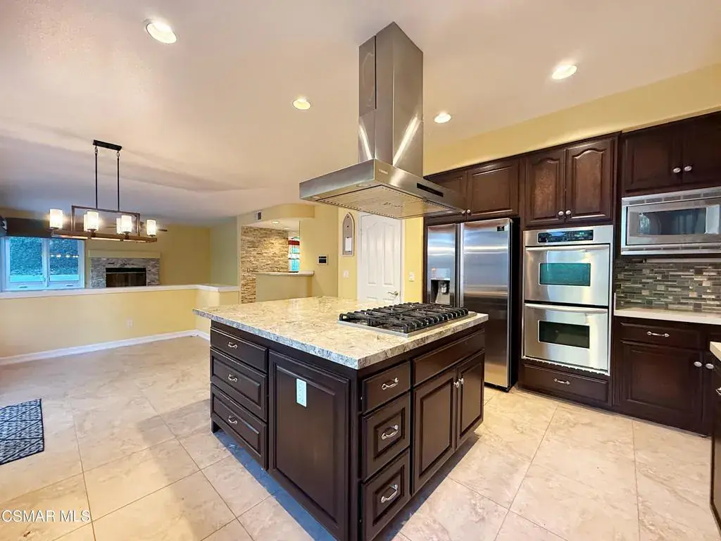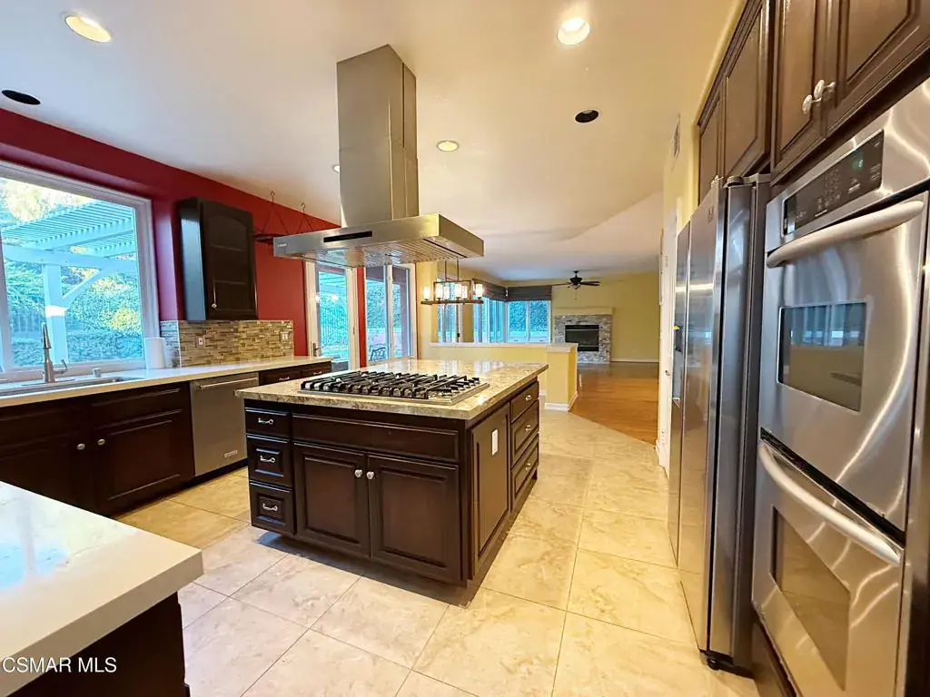 Welcome to this 4 bedroom, 3.5 bathroom, and 4,206 square foot home on a quiet street in Wood Ranch! Step into the double door entry that leads you to the beautiful formal living room with an additional conversation area and dining room. The gourmet kitchen is complete with ample counter space, center island, built-in 6 burner cooktop, refrigerator, double oven, and microwave. The kitchen opens to the family room with a cozy fireplace and beautiful views of the lush backyard. Upstairs you will find the 2 guest bedrooms which share a spacious bathroom, and a large bonus room perfect for a media room. The large primary suite is a perfect space to unwind in, with a cozy fireplace, extra sitting area, a balcony overlooking the mountains, and a spacious bathroom with dual vanities, jacuzzi tub, and oversized walk-in closet. The private backyard opens to the mountain side and is complete with two patio areas for entertaining and a large grassy area to play in! Amenities of this home include a downstairs bedroom with an en-suite bathroom, upgraded wood flooring, indoor washer and dryer, 3-car garage, and so much more! With an excellent location close to hiking, parks, shopping and entertainment, this home is a gem, and must not be missed!