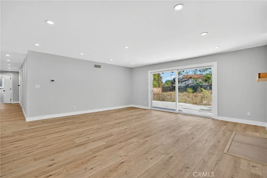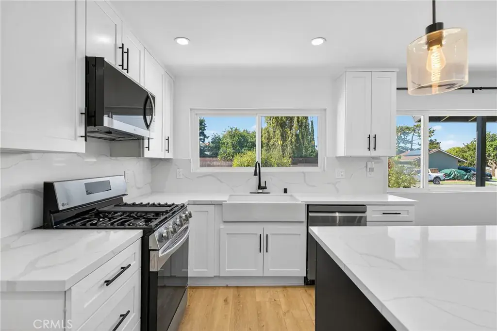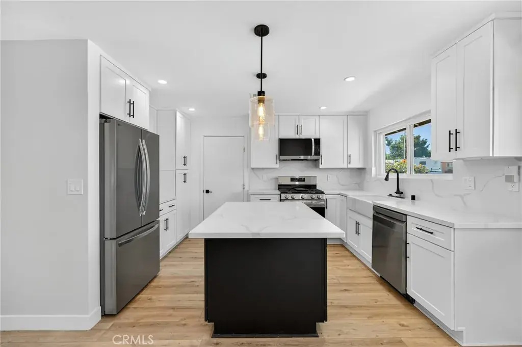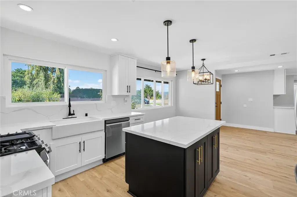 The fully renovated bathroom serves as a serene retreat, featuring a custom vanity, designer tile work, a new soaking tub, and contemporary lighting that evokes a spa like atmosphere. The kitchen is both beautiful and functional, showcasing shaker style soft close cabinetry, quartz countertops, and an oversized island with seating, ideal for both intimate meals and large gatherings. The open floor plan extends into the bright and inviting family room, complete with a cozy fireplace and sliding glass doors that lead to the backyard, creating a seamless indoor outdoor living experience.