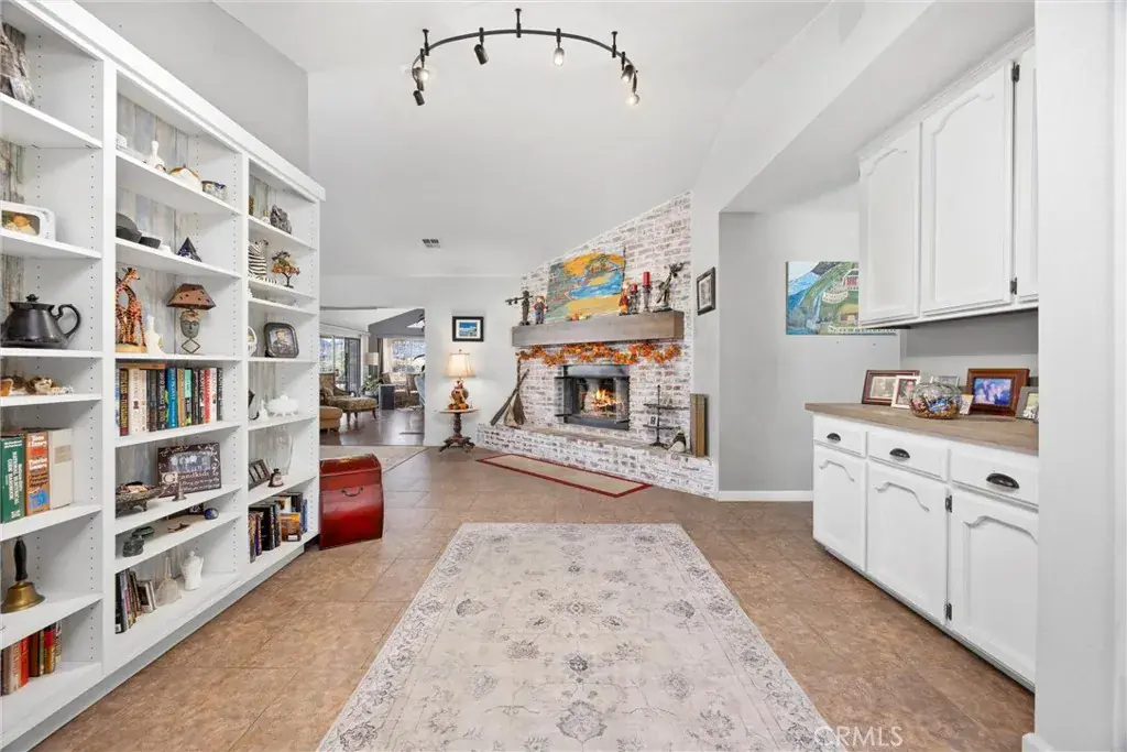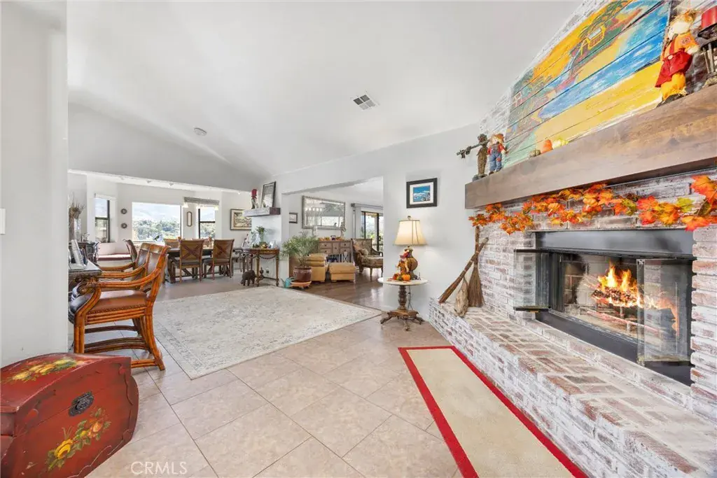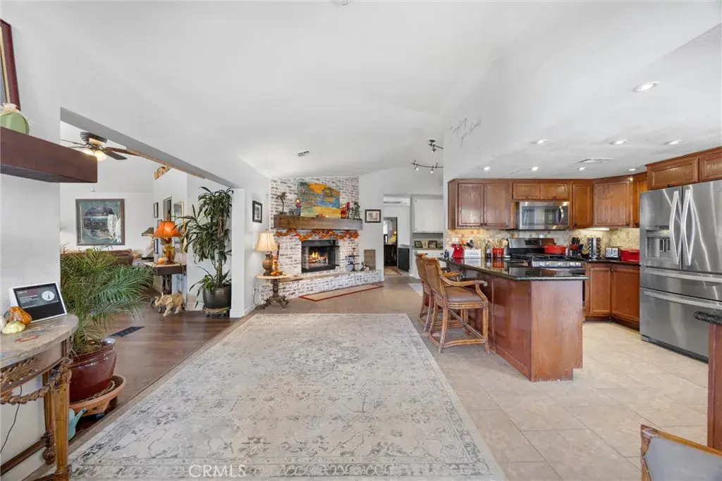 Step inside to an inviting open floor plan featuring a brick fireplace, wood-beam vaulted ceilings, and panoramic lake and mountain views from nearly every room. The updated kitchen showcases granite countertops, stainless steel appliances, and warm wood cabinetry, flowing seamlessly into the living and dining areas designed for entertaining and relaxation.