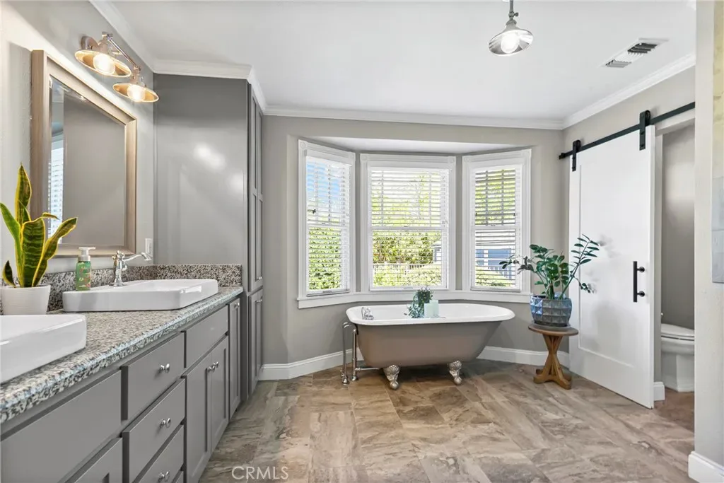 The luxurious primary suite offers a private retreat with a sitting area/home office, dual walk-in closets, and a spa-inspired ensuite bath complete with a freestanding clawfoot soaking tub and dual vanities. Additional amenities include a wine cellar/butler’s pantry, indoor laundry room, three-car garage, and a versatile loft space ideal as a private retreat, lounge, creative studio, or additional storage.