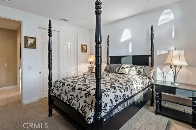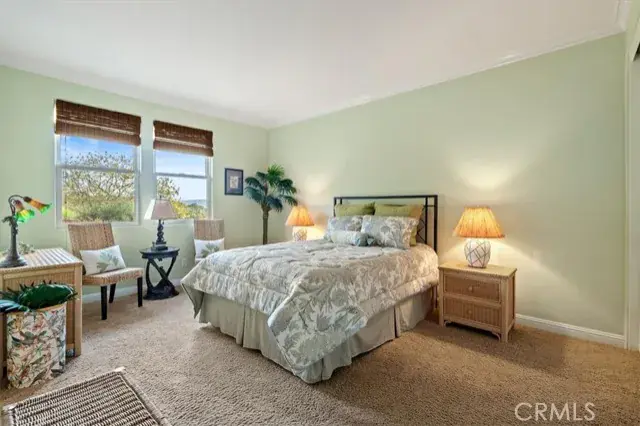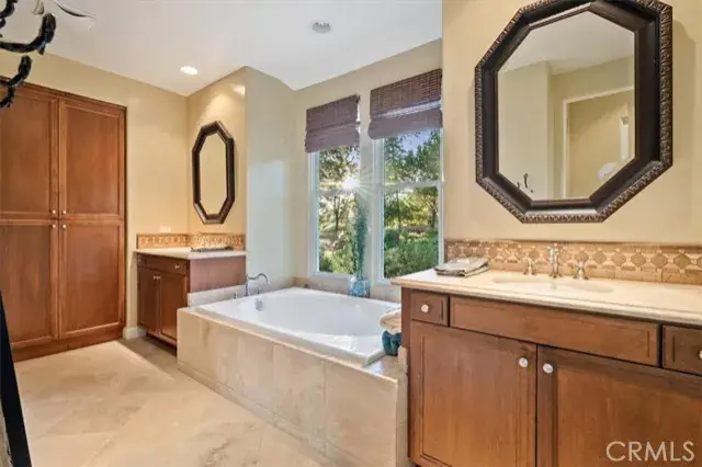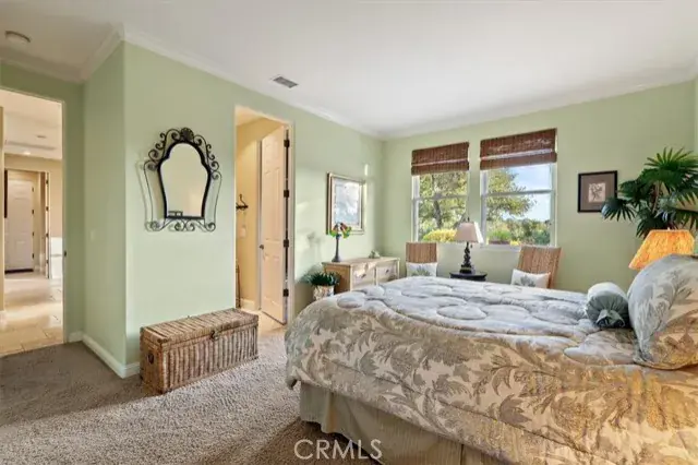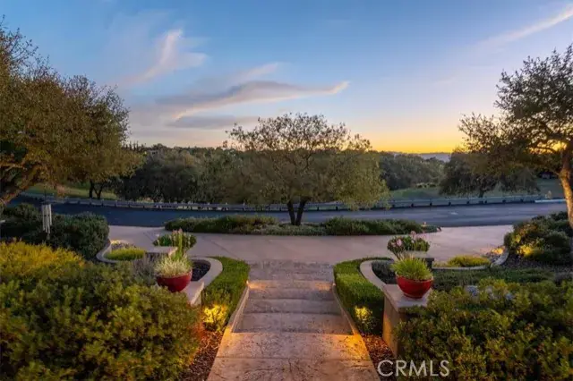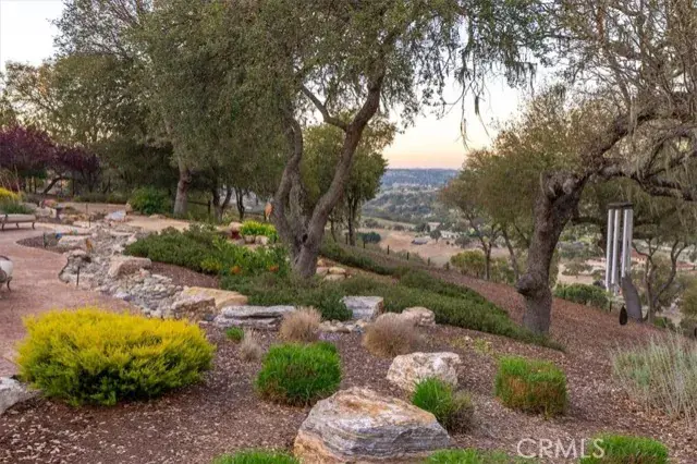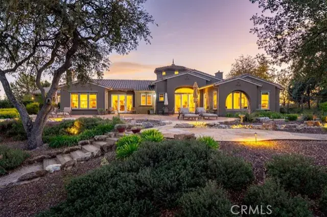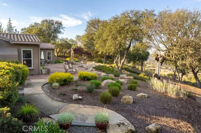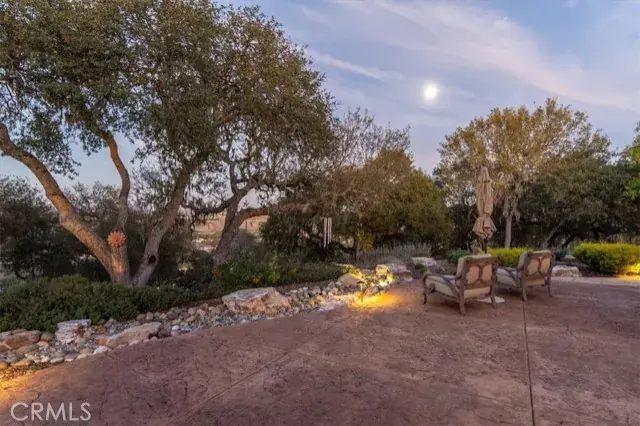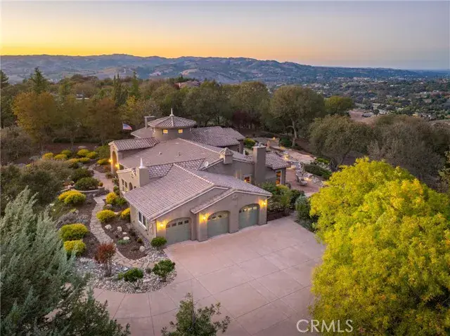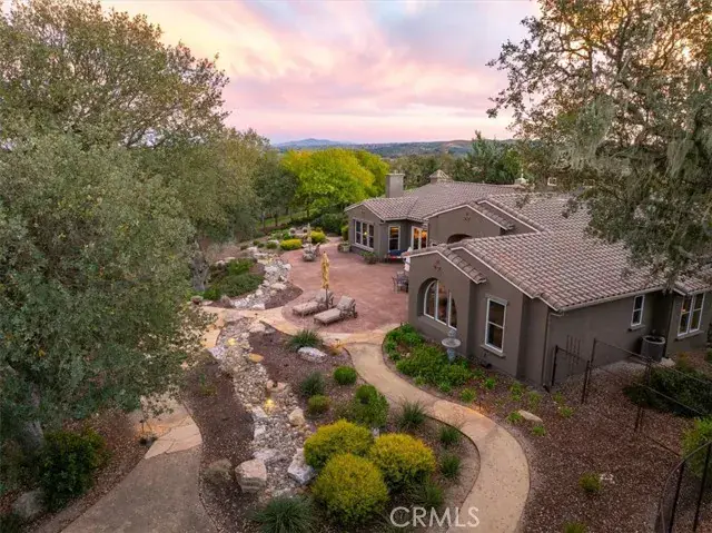 The spacious primary suite offers privacy, dual walk-in closets, and a luxurious bath with soaking tub and large shower. Additional bedrooms and a flexible office space capture beautiful hillside and sunset views. Outdoor living shines with expansive flagstone patios, multiple sitting areas, and lush landscaping surrounded by heritage oaks – perfect for dining, relaxing, or entertaining under the stars.