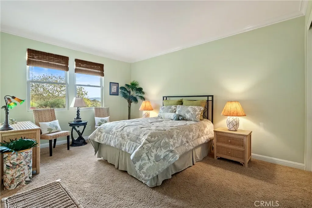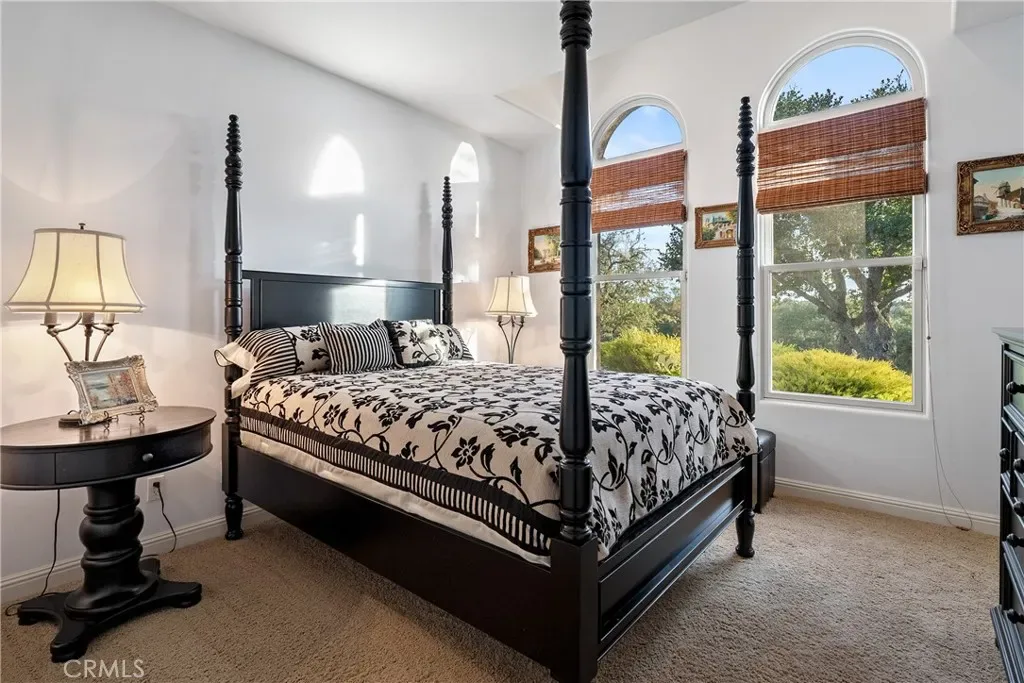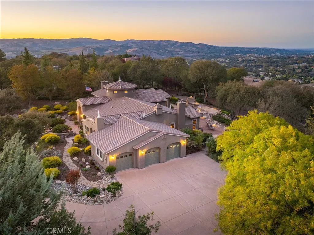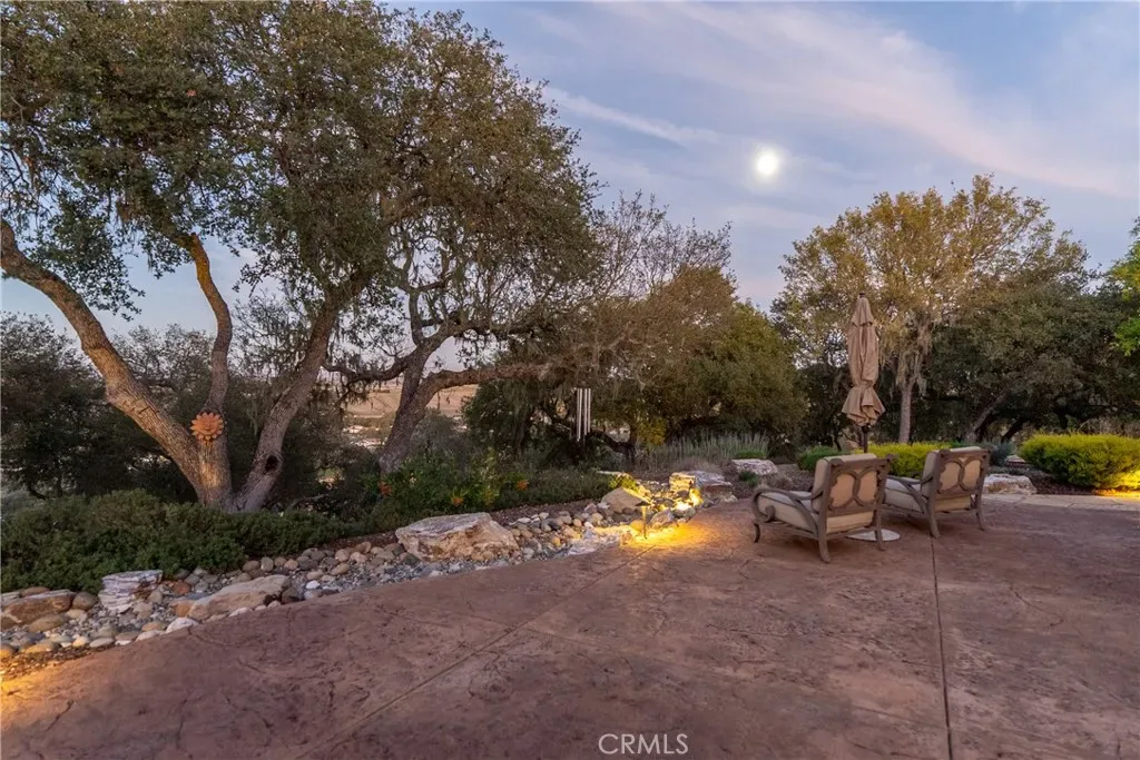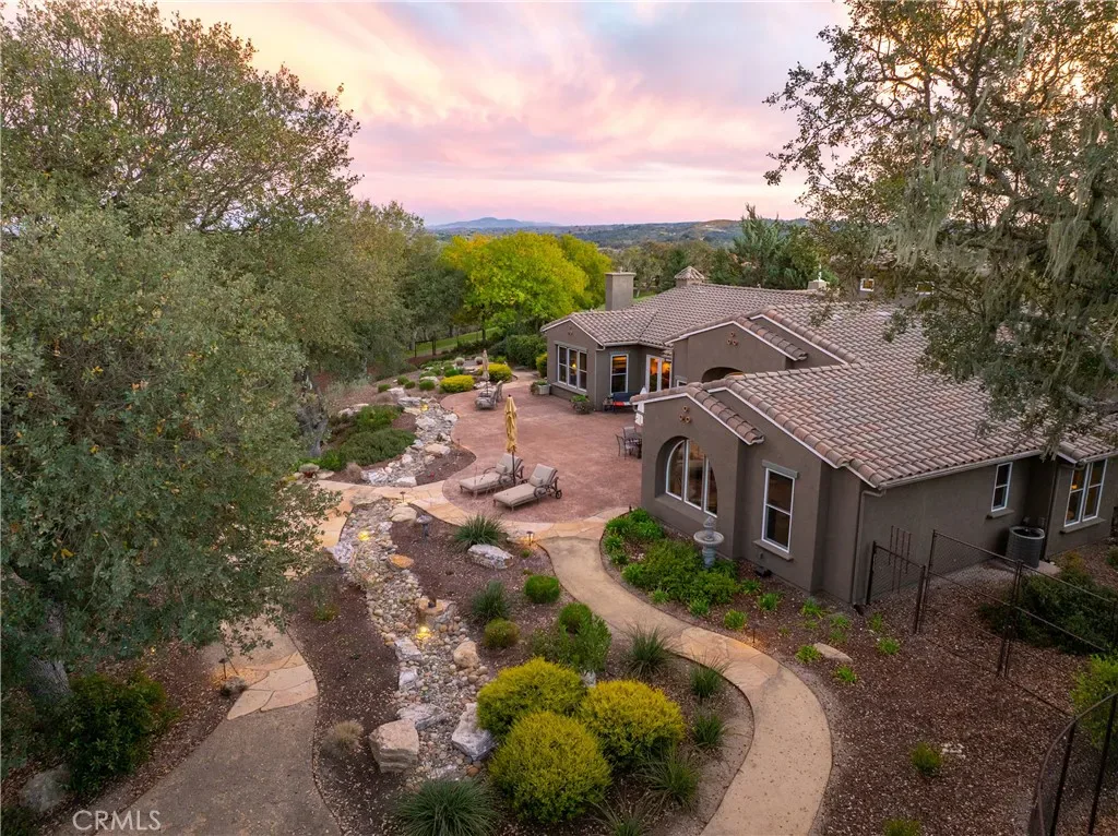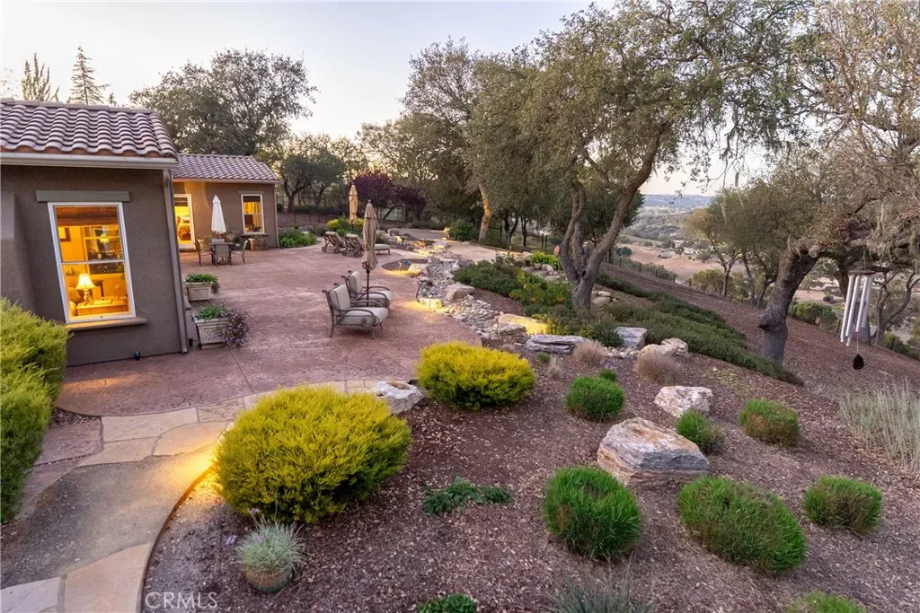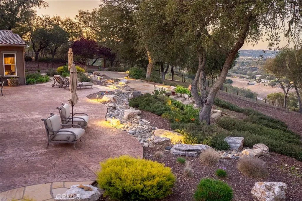 The spacious primary suite offers privacy, dual walk-in closets, and a luxurious bath with soaking tub and large shower. Additional bedrooms and a flexible office space capture beautiful hillside and sunset views. Outdoor living shines with expansive flagstone patios, multiple sitting areas, and lush landscaping surrounded by heritage oaks – perfect for dining, relaxing, or entertaining under the stars.