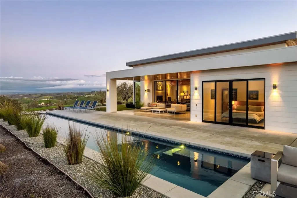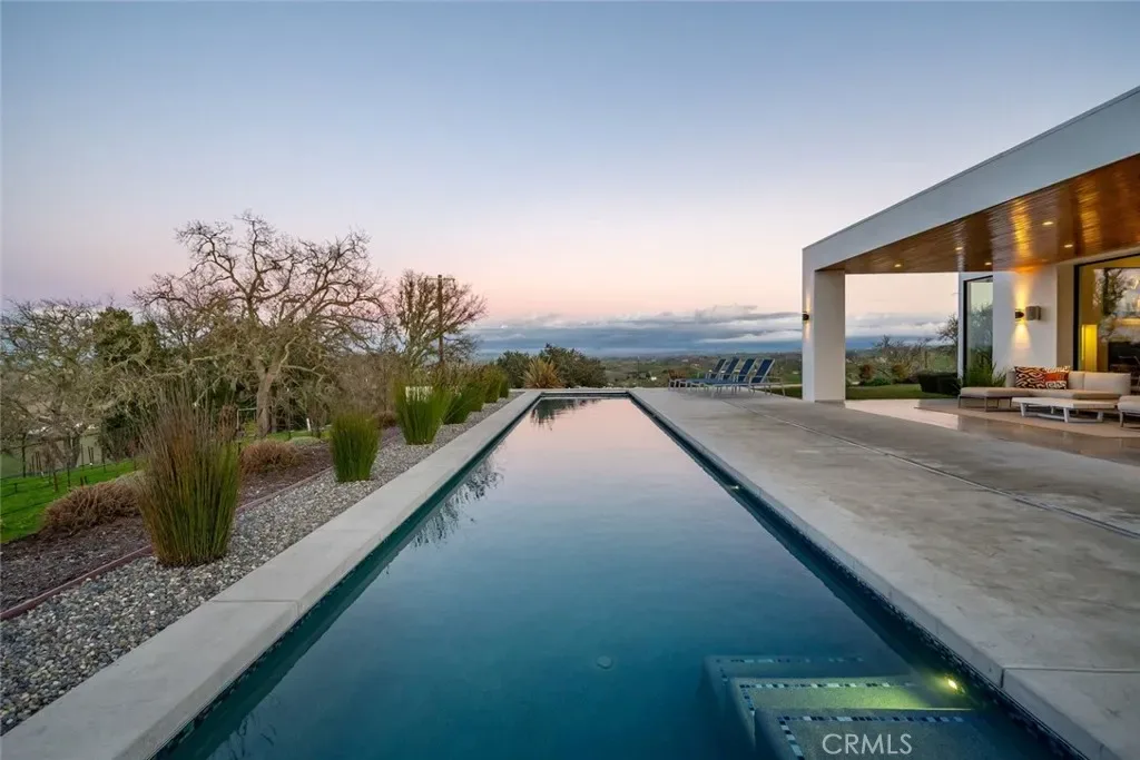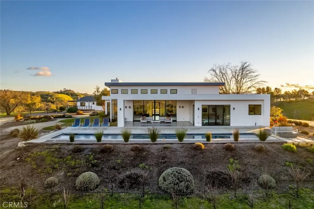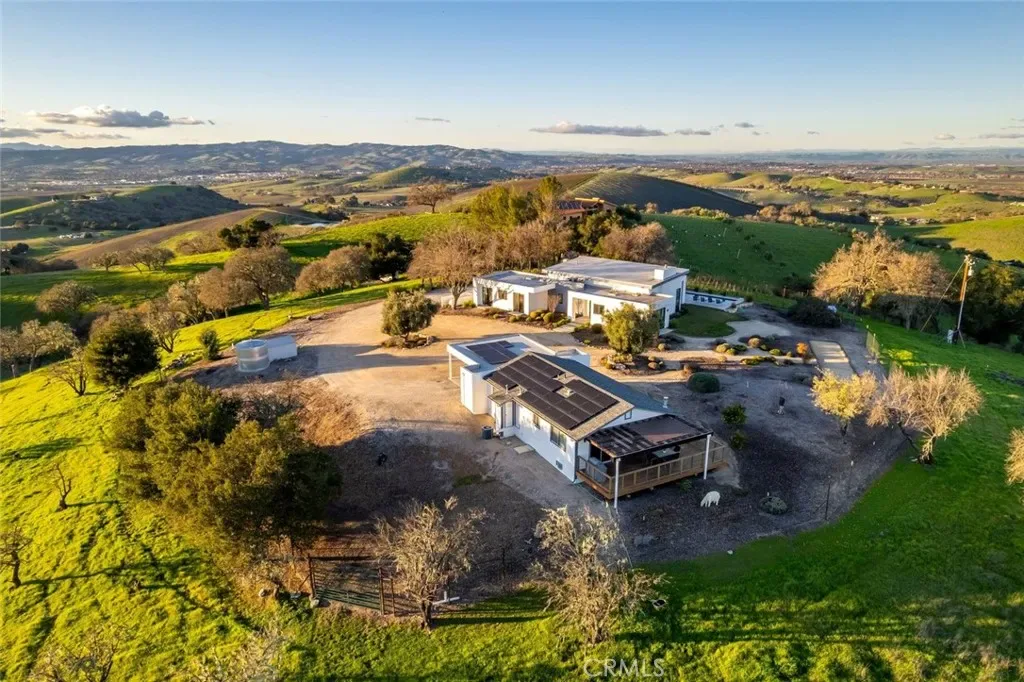 Award-winning architecture meets the soul of California’s Central Coast in this exceptional estate by Andrew Goodwin Designs, recipient of the 2020 AIA California Central Coast Award for excellence in design and execution. Privately situated at the end of a scenic country lane, the El Pomar Residence is a rare convergence of architectural distinction, natural beauty, and refined livability, balancing serenity with sophistication and lifestyle with income potential. The 2,727 square foot main residence offers 4 bedrooms and 3 bathrooms, defined by open, light-filled spaces and framed views of the rolling Paso Robles hills. Thoughtful craftsmanship is evident throughout with custom millwork, radiant heated floors, and curated finishes. A separate 1,092 square foot guest house features two bedrooms and one bathroom and operates as a fully permitted, high-performing short-term rental, complete with washer/dryer, dishwasher, and contemporary gas fireplace. Designed for beauty and efficiency, the solar-powered estate delivers near net-neutral electric costs and is supported by a single well and electrical system for both residences. The main home includes 4-zone HVAC, tankless water heater, RO water system, Dekton countertops, Bosch induction range, Bosch steam and convection microwave oven, Bosch warmer drawer, Electrolux refrigerator, a 650-bottle wine cellar, and an integrated indoor-outdoor sound system. Outdoors, a 60-foot lap pool anchors expansive decking and natural landscapes for seamless indoor-outdoor living. The property pioneers a unique agricultural legacy as the first commercial U.S. planting of the rare Italian varietal Nero di Troia, cultivated in partnership with Giornata, a premium Italian winery. Ownership includes annual complimentary wine allocation and seven additional acres of vineyard-ready land with prized calcareous soils. Key highlights include award-winning architecture, end-of-road privacy with panoramic vineyard and valley views, two residences on a single metered solar system, multi-generational living potential, full insurance including liability and earthquake coverage, proven rental income, premium vineyard acreage, proximity to regional and private airports, a 60-foot lap pool, radiant heated floors, and a turnkey lifestyle with furnishings available. Just 15 minutes from downtown Paso Robles and 30 minutes from San Luis Obispo Airport, this is a rare offering where design, agriculture, income, and lifestyle converge.