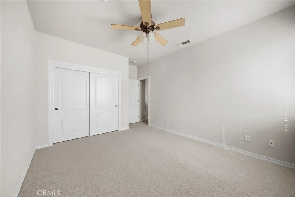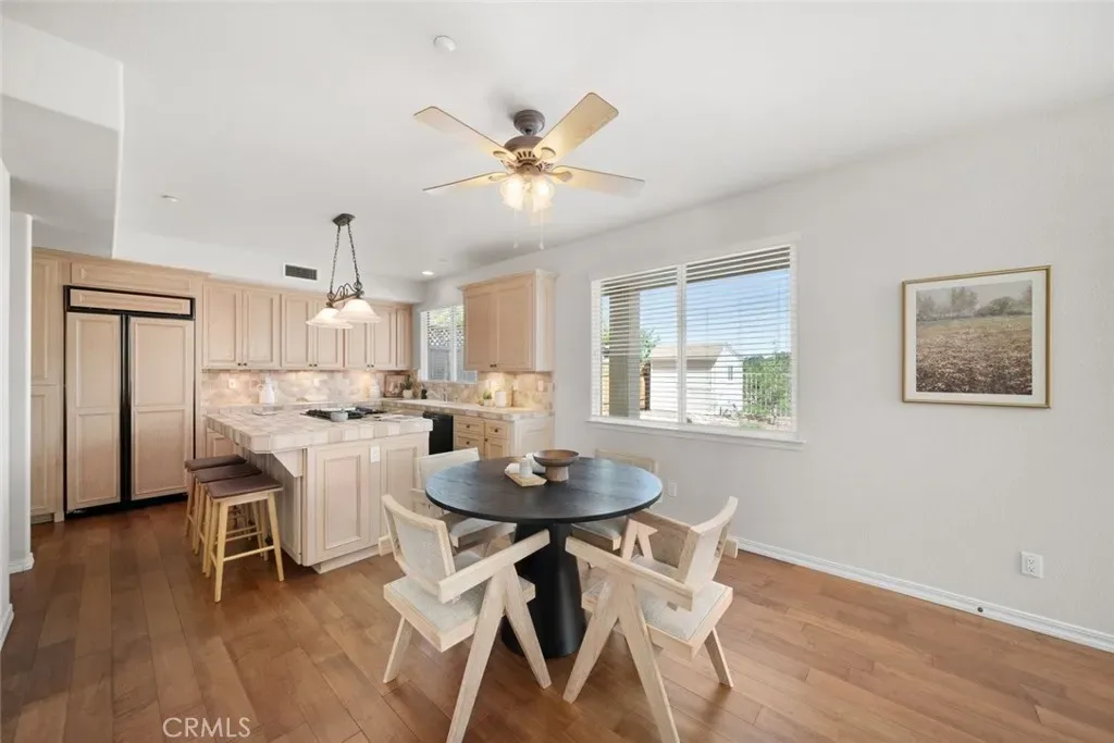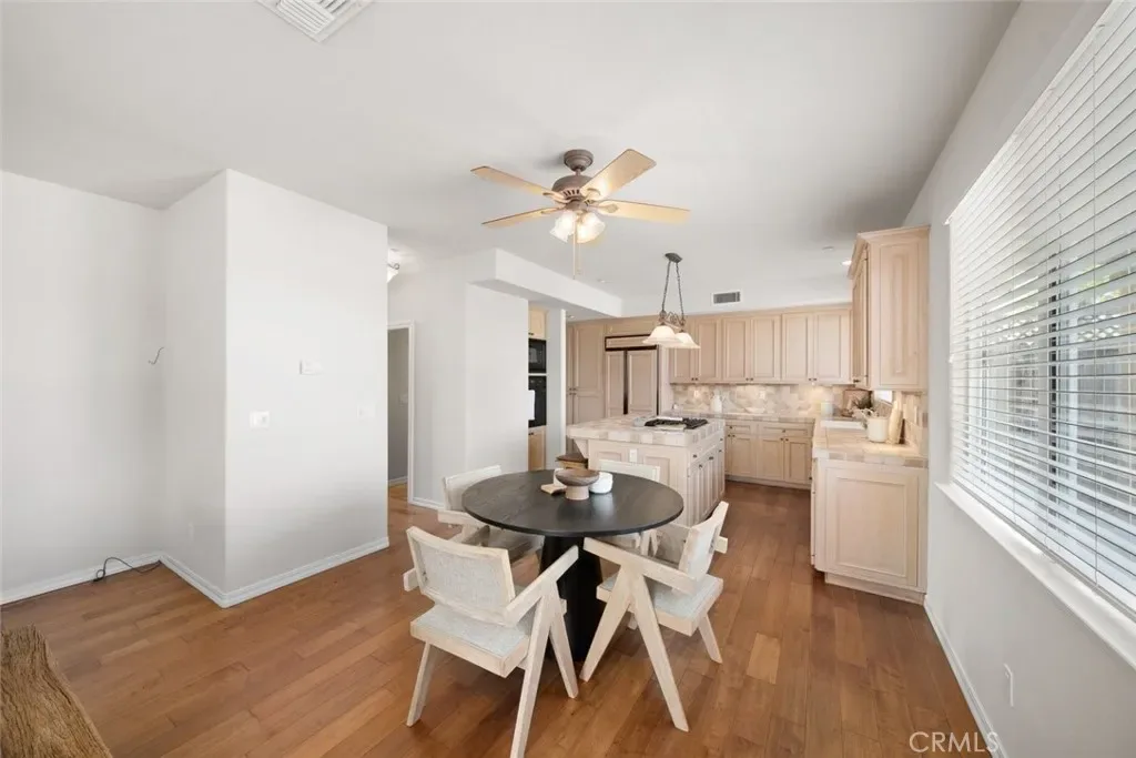 The home opens up to a generously sized kitchen with ample counter space and storage, perfectly positioned to connect with the main living area. Just beyond, the family room offers a comfortable setting with a cozy gas fireplace and direct access to the backyard, where you’ll enjoy peaceful views of the surrounding hills.