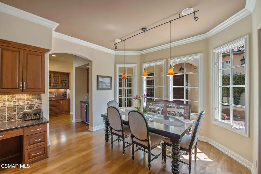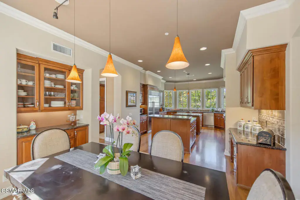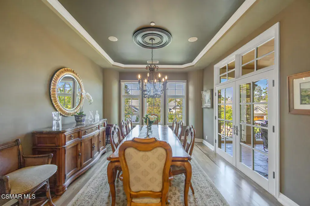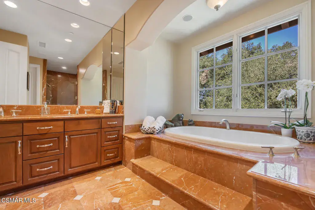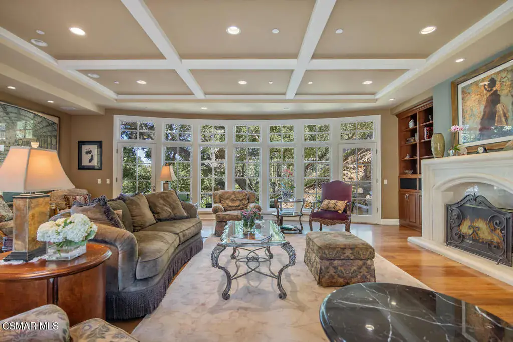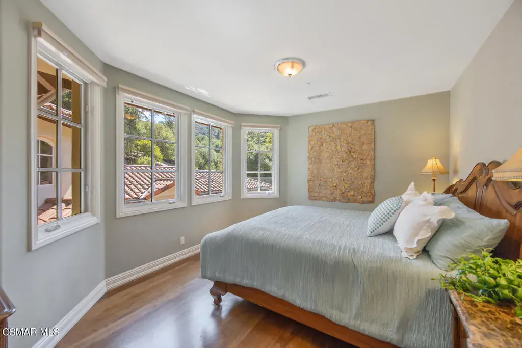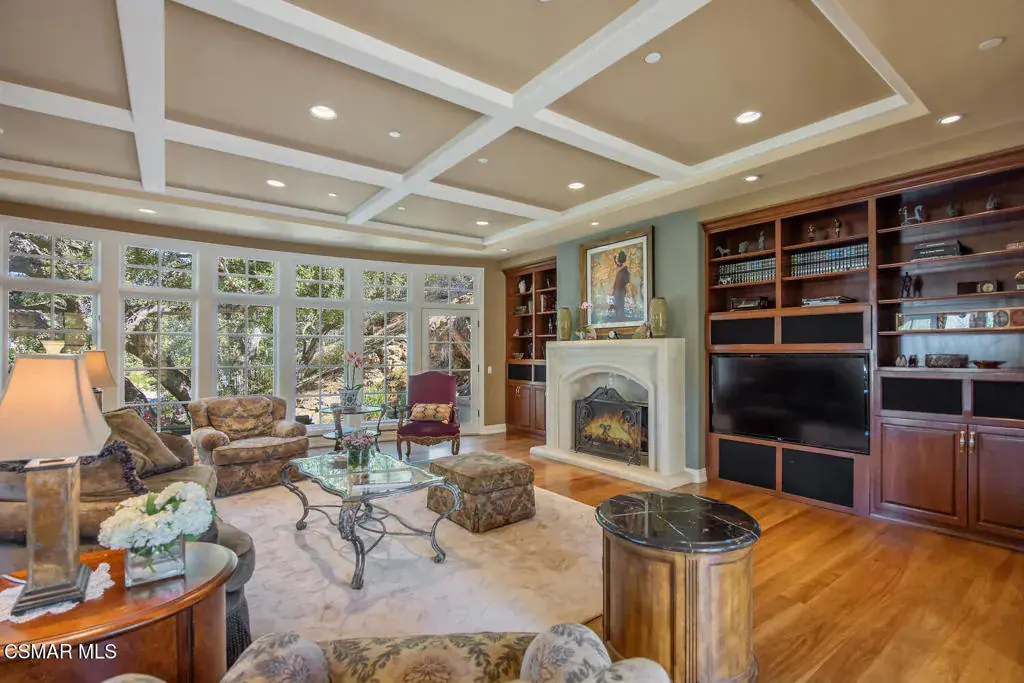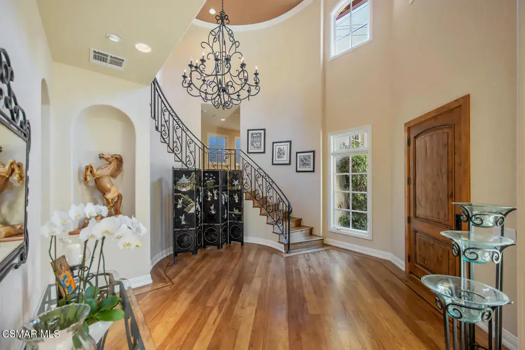 Located behind the 24/7 guard gates of prestigious Lake Sherwood, this stunning custom Spanish estate is a rare offering with NO HOA dues. Designed with luxury living in mind, the 4,248 sq ft home is newer, built in 2002, and is a masterpiece of elegance and warmth. A welcoming courtyard sets the tone, complete with a soothing fountain, covered patio, fireplace, and a built-in BBQ. Entering the home you will be impressed by the grand rotunda entry with a wrought iron curved stairway. The home boasts four spacious bedrooms, all of which have en-suite bathrooms. The enormous great room features a wall of windows and French doors that open to a large patio overlooking views of the lake, majestic oak trees, and a waterfall that cascades directly from natural rock. Both the great room and the primary bedroom feature dramatic coffered ceilings and large custom fireplaces. The chef’s kitchen is a dream, designed with two islands, dual sinks, dual dishwashers, granite counters, and top-tier stainless appliances. The formal dining room opens seamlessly to a veranda for indoor-outdoor entertaining. Every bedroom is an ensuite, offering large baths and spacious closets. The primary is exceptionally spacious and features an elegant private patio reminiscent of an Italian villa, dual walk-in closets, and a large bath complete with soaking tub and oversized shower. Outdoors, you can take unwind in the relaxing spa surrounded by mature trees. Enjoy multiple patios which invite relaxation among the wooded grounds which cover a fully fenced 3/4 of an acre, creating a sense of peace and seclusion. The 4-car tandem garage, is thoughtfully designed with a split AC system, a Tesla EV charger and a car lift. This home also offers a newer three zone HVAC system and TONS of storage. Living behind the gates in Sherwood means access to the private park and private playground plus rights to use the lake (boating, swimming, fishing and kayaking). Behind the gates there are two country clubs, one with a world-class golf course. A rare opportunity to own an elegant custom home with no HOA dues behind the gates of Lake Sherwood..