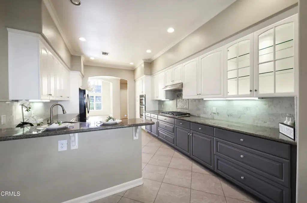Welcome to this one-of-a-kind custom Mediterranean-style hillside retreat, privately nestled on an expansive .34-acre lot in a secluded enclave of Thousand Oaks–where timeless architecture, serene surroundings, and breathtaking views come together. Elevated above it all, the home captures sweeping vistas of rolling hills, city lights, and surrounding mountains, offering a true sense of privacy and escape.Inside, the inviting living room is anchored by soaring volume ceilings and a dramatic stone fireplace, creating a warm yet grand setting for everyday living and entertaining. The gourmet eat-in kitchen is thoughtfully designed with an abundance of maple cabinetry, granite countertops, elegant marble herringbone backsplash, convenient breakfast bar, a spacious pantry, and seamless flow into the heart of the home. A formal dining room showcases voluminous ceilings and gorgeous hillside views, making it ideal for memorable gatherings.The primary suite is a true retreat, featuring a sitting area, rich wood floors, and dual walk-in closets. The spa-inspired primary bath offers marble countertops, a marble tub surround, a striking walk-in shower, and dual sinks. Two additional spacious bedrooms feature large closets and oversized windows, while the hall bath continues the elegant theme with dual sinks and neutral marble finishes.A versatile loft provides a flexible fourth room option–perfect as a home office, bonus room, gym, or creative space. The three-car garage includes a massive workshop area and a convenient owner-installed lift for groceries or luggage, adding thoughtful functionality to daily living.Step outside to a private entertainer’s backyard featuring low-maintenance turf, a spacious covered patio, and a relaxing hot tub — perfect for unwinding while taking in the peaceful surroundings. Follow the outdoor staircase up the hillside to enjoy beautiful views and a deeper connection with nature. Additional highlights include surround sound, crown molding, dual-pane windows with wood-framed sills, dual-zone heating and air, skylights, recessed lighting, a spacious private laundry room, and an oversized septic system.This is more than a home–it’s a rare custom residence offering space, views, privacy, and versatility in one of Thousand Oaks’ most desirable hillside settings.