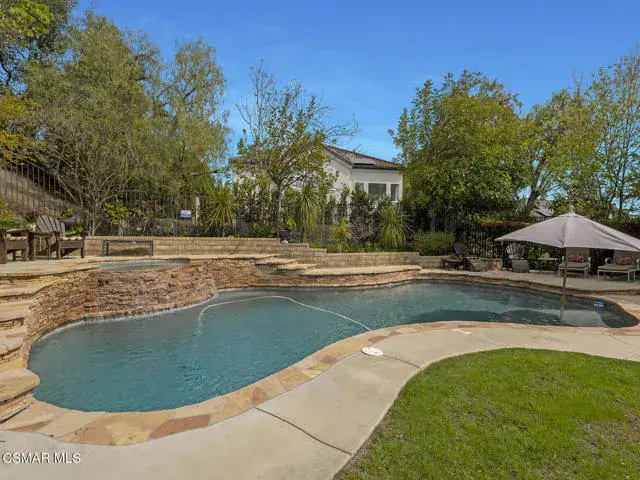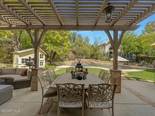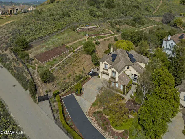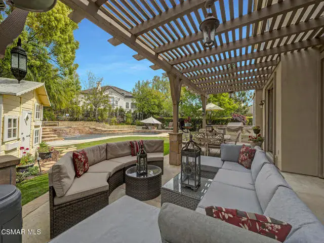 *Sellers will consider buying down the interest rate by 1% for first year using our preferred lender.* Welcome to 331 Briar Bluff Circle–a gorgeous 4-bedroom, 4-bath home located on a quiet cul-de-sac with a main floor dedicated office (next to a closet and full bathroom), built in 1999 and lovingly maintained by its original owners. Set on over an acre in the scenic hills of Thousand Oaks with a level main front and backyard, this 3,608 sq ft home offers exceptional indoor-outdoor living with lush landscaping, flagstone hardscaping, garden lighting, a resort-style pool and spa, outdoor kitchen with built-in sink, grill, storage, refrigerator and bar-top umbrella seating area. The upper tier includes a sunset-view patio overlooking Thousand Oaks, play yard, and horseshoe pit–ideal for entertaining or future expansion such as an ADU or sport court. Back down the flagstone steps to the backyard are 3 patios-1 large patio attached to the home with a patio cover over a dining space and outdoor family room. The other 2 patios are attached to the pool and elevated spa deck-one with a fire pit. These areas are enhanced with gated side yards with an arched vine covered walkway through a topiary and rose garden and a gated side yard–perfect for pets. And not to miss the vine covered gazebo in the front yard -perfect for gazing at the unobstructed sunsets. Inside, enjoy wide-plank hardwood floors and newer carpet on the main floor with a formal dining room open to a light and airy living room with tons of windows, a roomy open concept kitchen with granite countertops, large island, upgraded cabinetry, large built in ovens, butler’s pantry with wine refrigerator, open to a another spacious dining area and family room with a gas fireplace next to a laundry/mud room conveniently located by the garage and door to the side yard. Upstairs are 4 generous bedrooms (2 bedrooms with walk-in closets) with a large loft area including a double linen cabinet and 3 elevated styled full bathrooms. The huge, luxurious primary suite with a sitting room over looks a gorgeous backyard and includes 2 walk-in closets next to a new spacious, well appointed bathroom with large stone tile throughout, new vanities with quartz countertops, a large walk-in shower with glass surround, a deep soaking tub all with updated lighting and bathroom hardware. 10 and 15 foot ceilings throughout the home with framed windows in main areas and primary spaces along with sleek crown molding. Thoughtful upgrades like a Ring doorbell and cameras, a security system, battery back-up automated garage door opener and assumable lease solar panels ($204/mo., cuts bill down to zero) enhance comfort and efficiency. Every interior room has had renovated touches! Bordering Wildwood Park trails and open space, this one-of-a-kind home blends privacy, elegance, and everyday convenience.