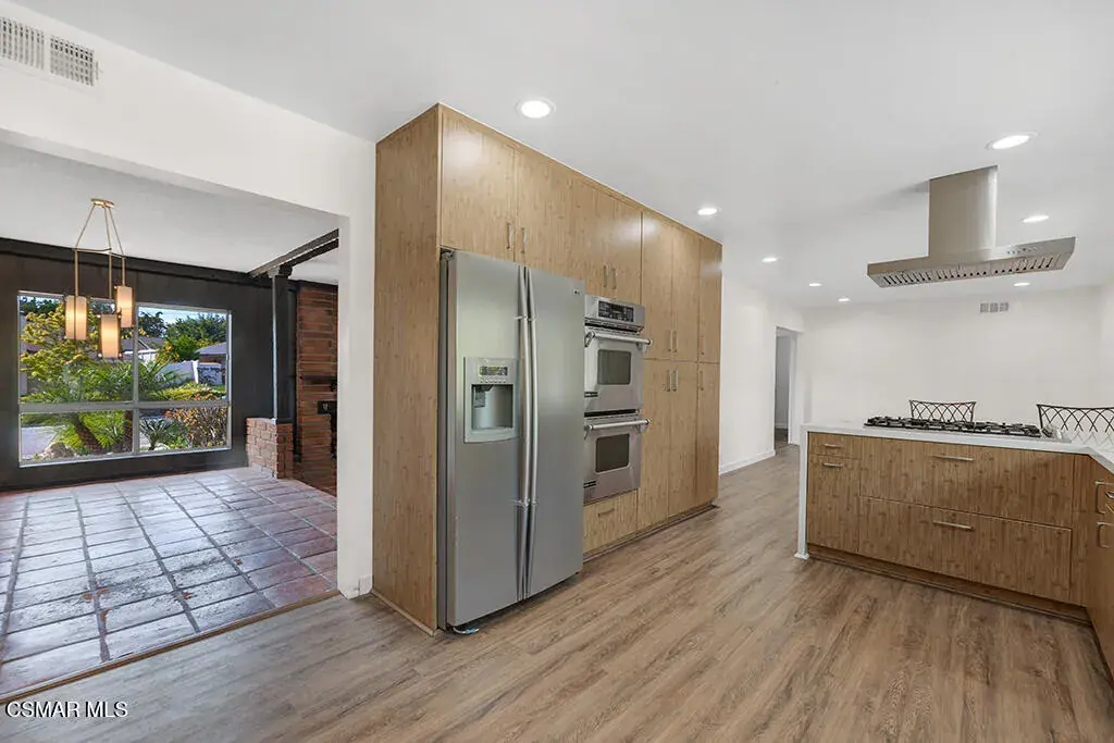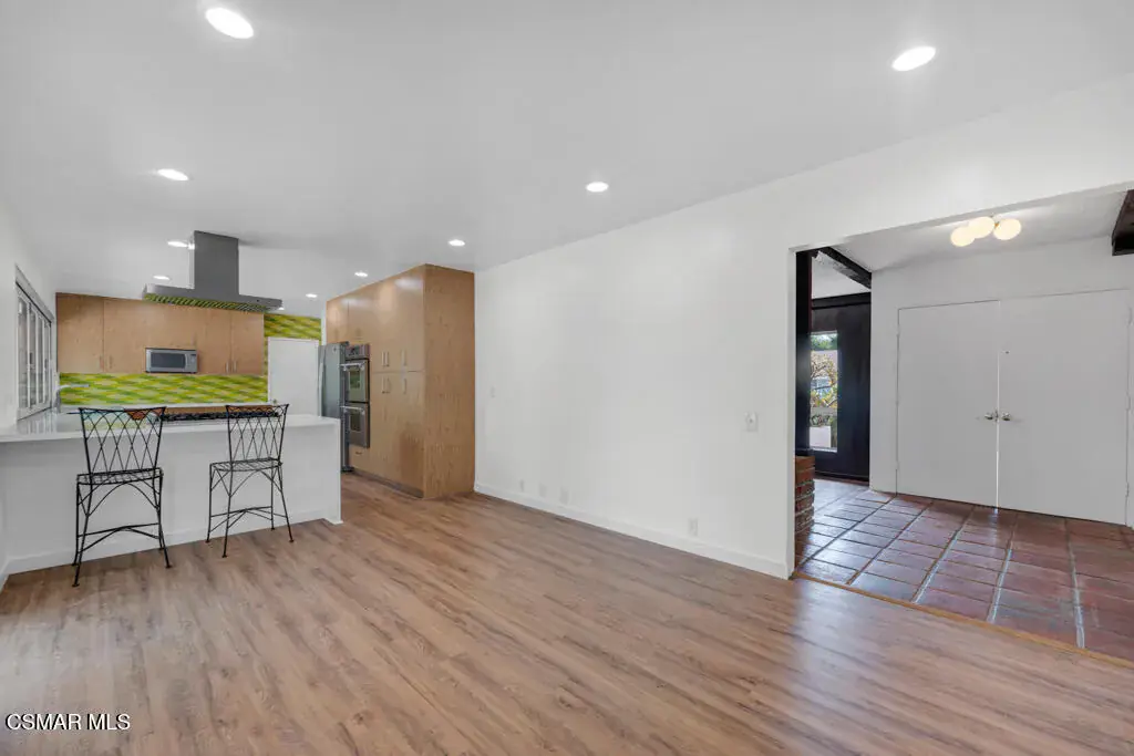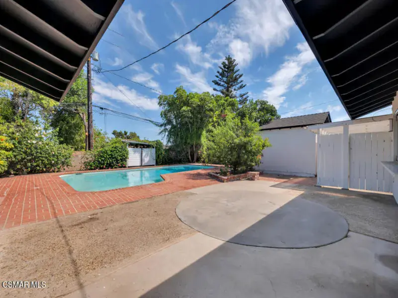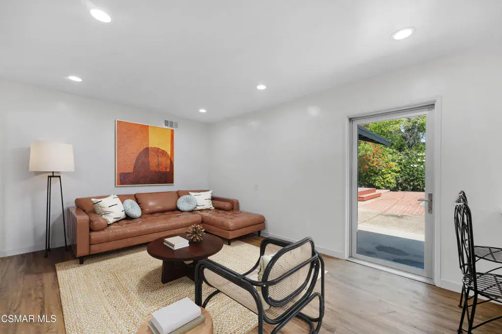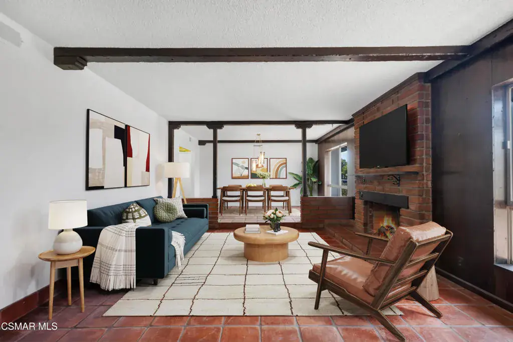 Welcome to 1558 Norwich Ave.! – a stunning 5-bedroom, 2-bathroom, 2,065 sq ft mid-century modern style home located in the highly sought-after Shadow Oaks neighborhood of Thousand Oaks. This gem boasts charming curb appeal, a classic double-door entry and beautifully blends timeless design with modern updates. Step inside to find Spanish tile flooring, exposed beam ceilings, stylish light fixtures, bold accents and floor-to-ceiling windows that bathe the home in natural light. The inviting living room features a large brick fireplace–perfect for cozy evenings. Enjoy the spacious kitchen offering quartz countertops, stainless steel appliances, a farmhouse sink, breakfast bar, recessed lighting and unique folding kitchen windows that create a seamless indoor-outdoor flow–ideal for entertaining with a convenient pass-through to the backyard. The primary suite is a private retreat showcasing an updated ensuite bathroom. Four additional bedrooms (one with a large glass slider leading to the backyard), a beautifully upgraded guest bath, laundry room with ample storage and a direct-access 2-car garage complete the thoughtfully designed interior. Outside, relax in your very own backyard oasis with a sparkling pool, sun deck, garden with lemon & peach trees, a detached air-conditioned workspace/art studio (with a window) as well as plenty of space to unwind. Centrally located near shopping, dining, award-winning schools, parks, hiking trails and more – welcome home! *Additional amenities include – freshly painted interior/exterior, solar, newer HVAC/ducting & plumbing.