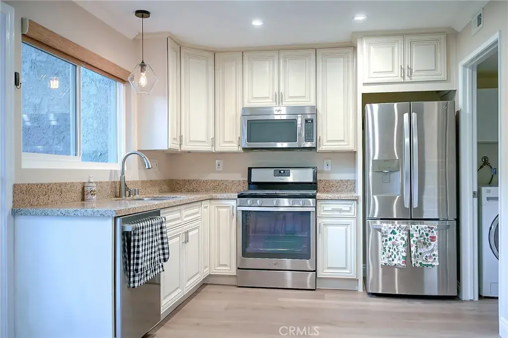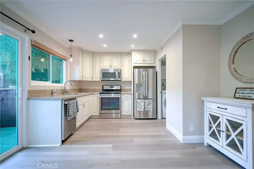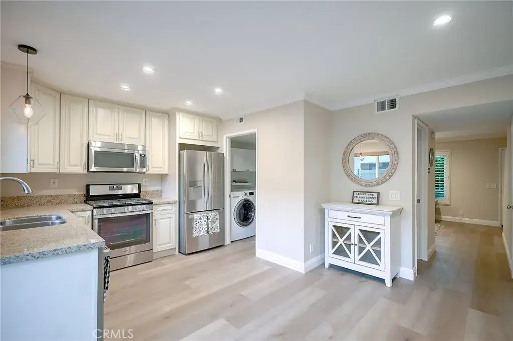 Appliances including refrigerator, washer, and dryer are included. Furniture, including a bed and large-screen TV, is negotiable.